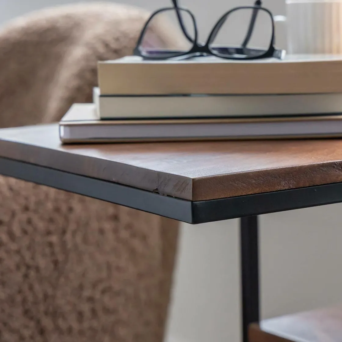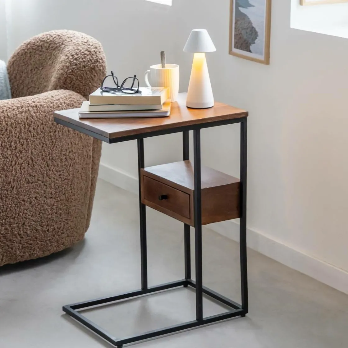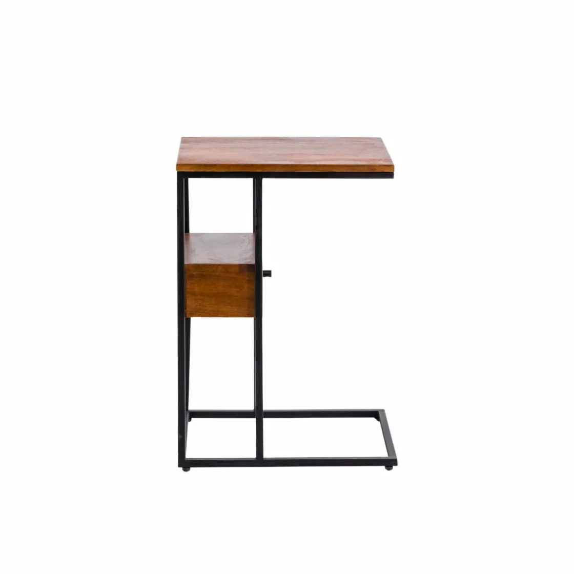 Ce bout de canapé en bois de manguier et métal allie praticité et modernité. Son design en forme de « C » permet de le glisser facilement près d’un canapé ou d’un fauteuil, offrant une surface d’appoint idéale pour poser une tasse, un livre ou un ordinateur. Le mariage du bois de manguier, aux nuances naturelles et chaleureuses, avec la structure métallique noire, apporte une touche industrielle élégante à votre intérieur.