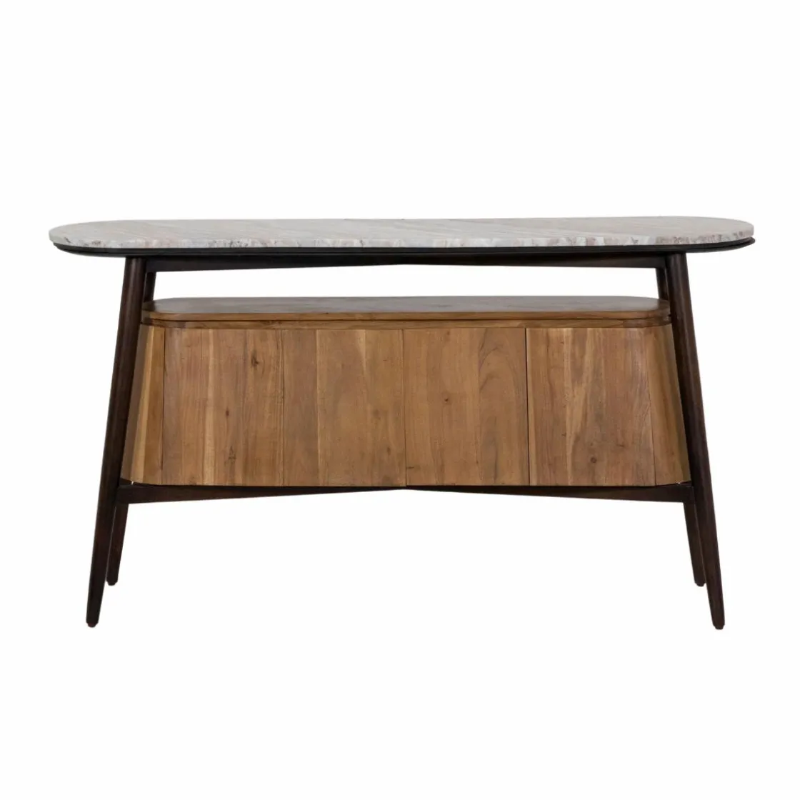 Ce buffet en bois d’acacia, métal et marbre séduit par son design audacieux et sa composition de matières nobles. Le veinage riche et chaleureux du bois d’acacia contraste élégamment avec la finesse du piètement en métal noir et l’éclat sophistiqué du plateau en marbre. L’ensemble, aux lignes arrondies et à la silhouette élancée, apporte une vraie touche d’élégance contemporaine à votre intérieur.