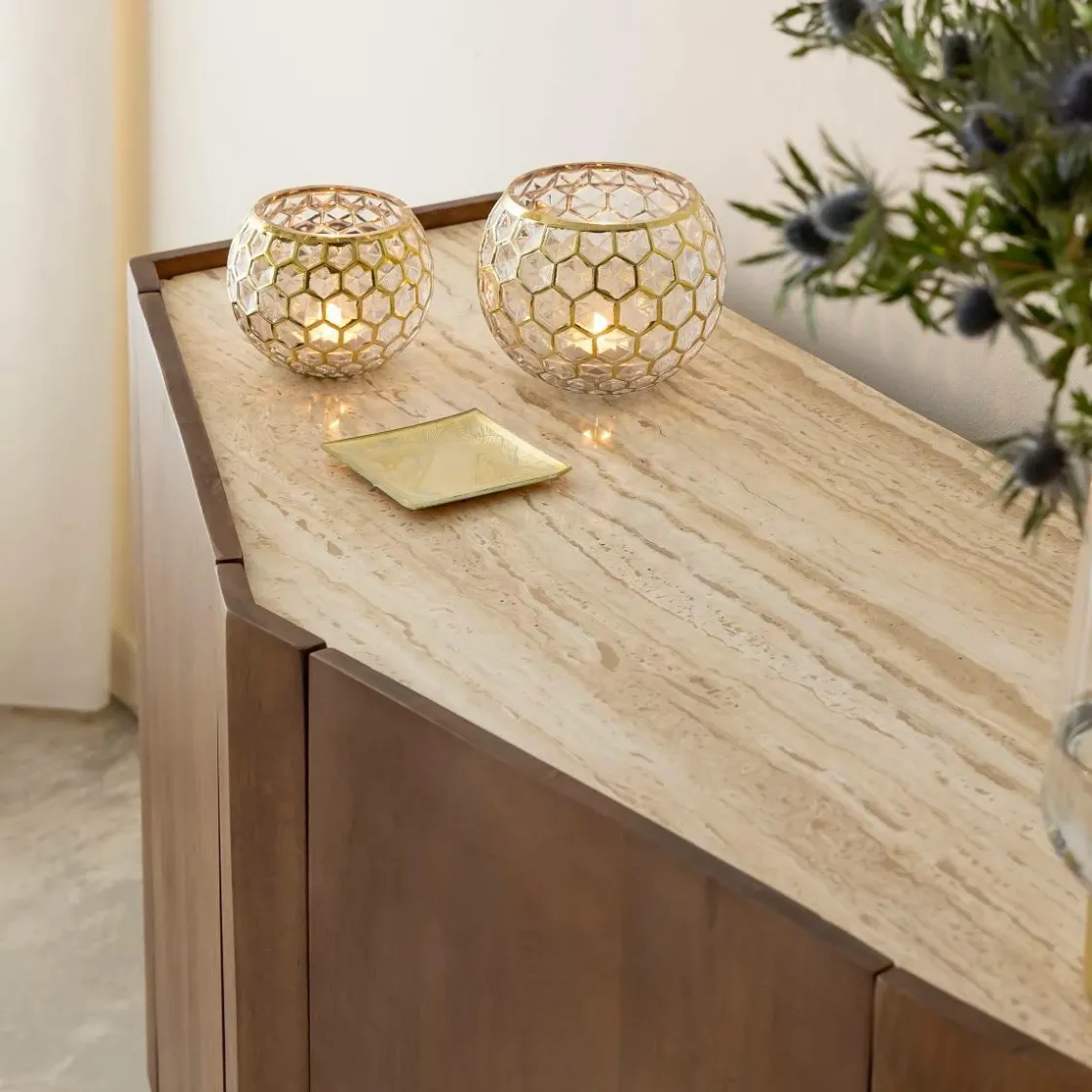 Le Buffet en bois de manguier et travertin Azure est une œuvre d’art qui marie élégance authentique et design scandinave. Composé de bois de manguier foncé et de travertin, il infuse sophistication et chaleur dans votre espace tout en conservant une allure moderne et épurée.