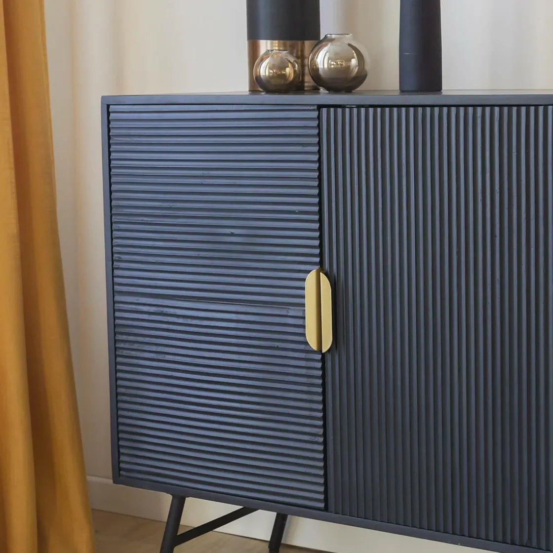 On imagine très bien ce buffet bois massif se fondre aussi bien dans une déco de style scandinave que bohème. Son design hors du commun vous permettra de viser dans le mille si vous souhaitez être au top de la tendance. Sa couleur dominante noire, amenée par le bois de manguier teinté, vient ajouter de la profondeur dans le meuble et dans votre intérieur. Vous pourrez facilement l’intégrer dans une ambiance claire et épurée afin de venir casser ce climat parfois trop blanc. Il possède des détails de couleur laiton, notamment sur les deux poignées, qui lui donnent une touche très chic.
