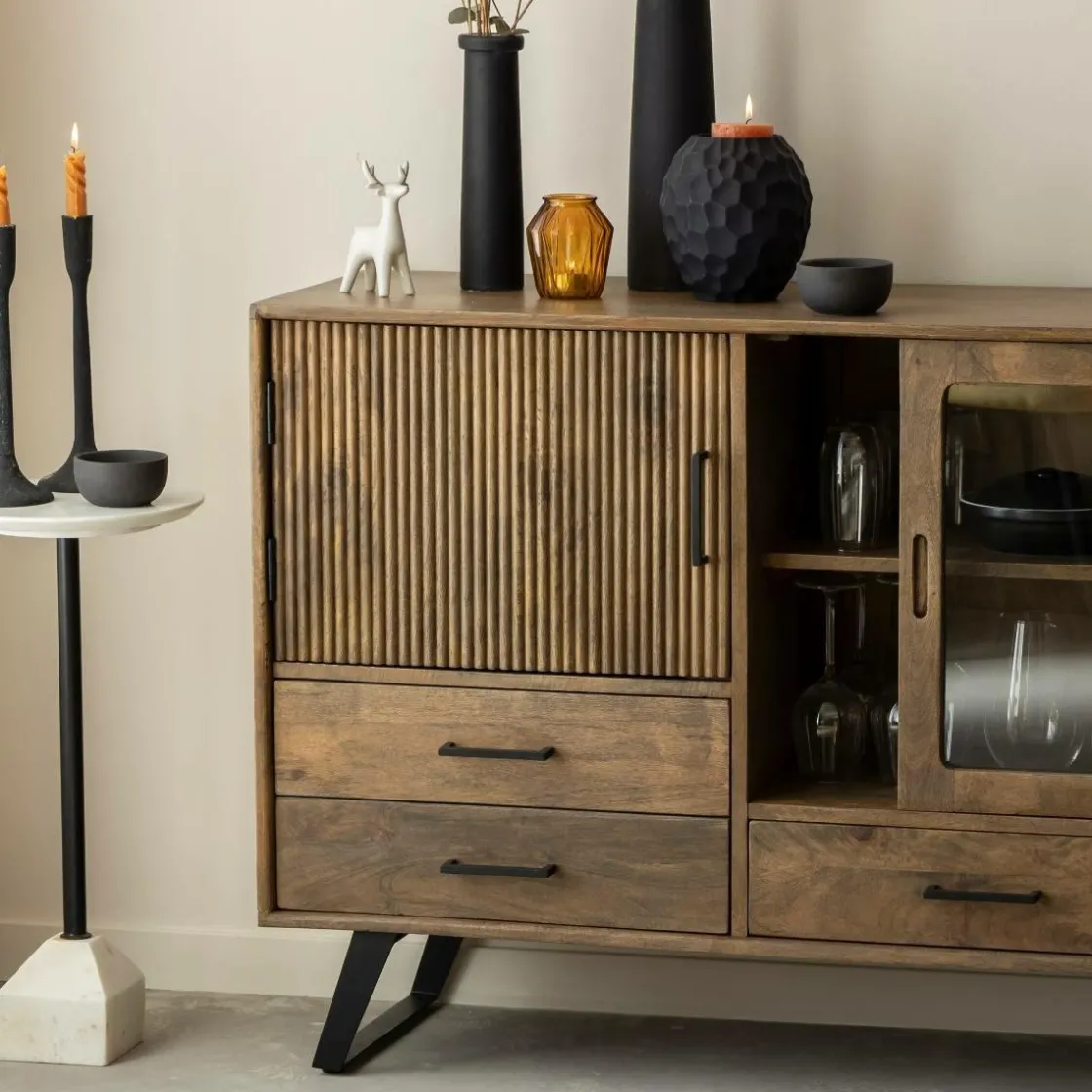 Le buffet Joy est une pièce remarquable qui allie fonctionnalité et élégance dans un style contemporain. Fabriqué en bois de manguier de haute qualité, il présente une finition soignée qui met en valeur la beauté naturelle du bois. Les portes en verre ajoutent une touche de sophistication tout en permettant de mettre en valeur la vaisselle ou les objets de décoration que vous souhaitez exposer.