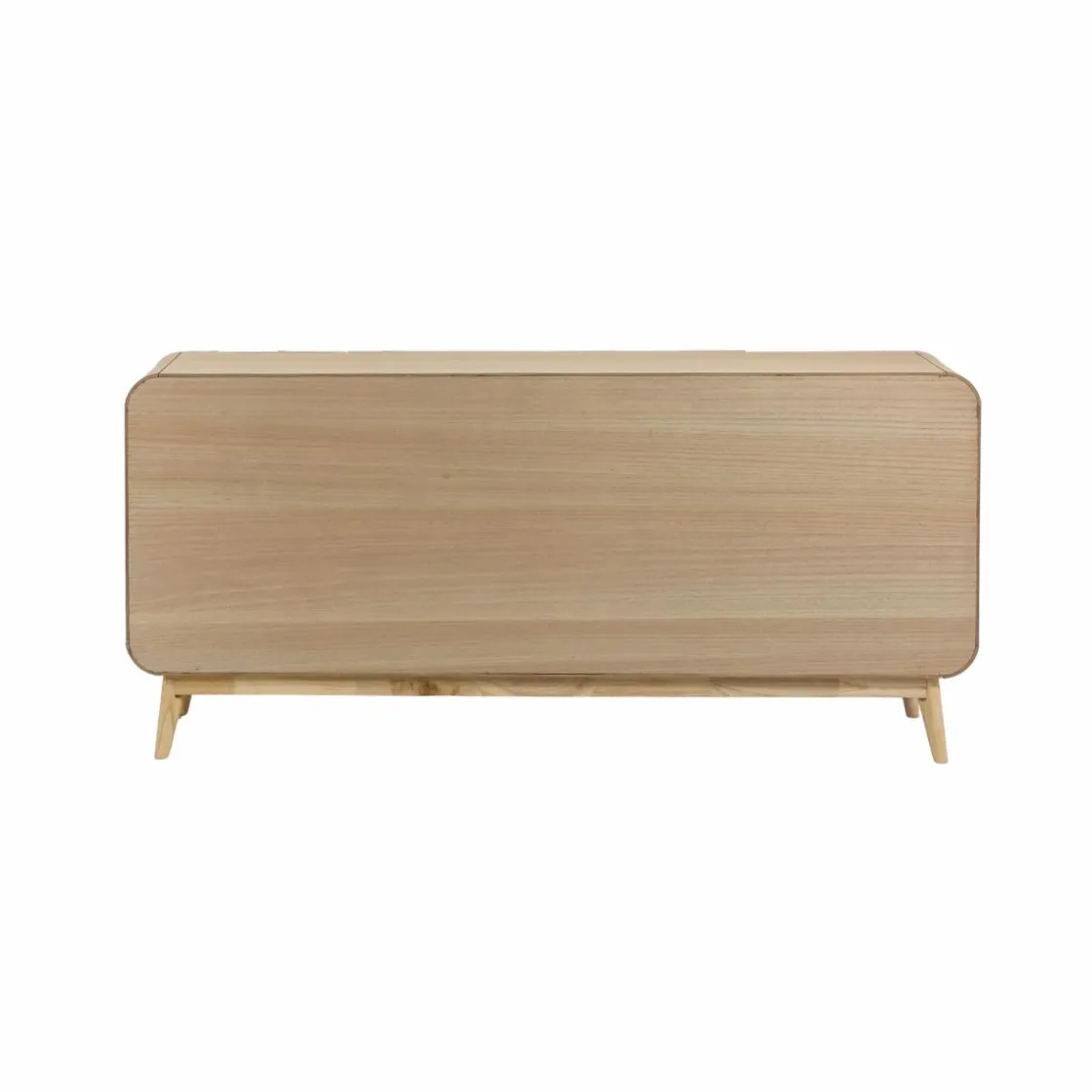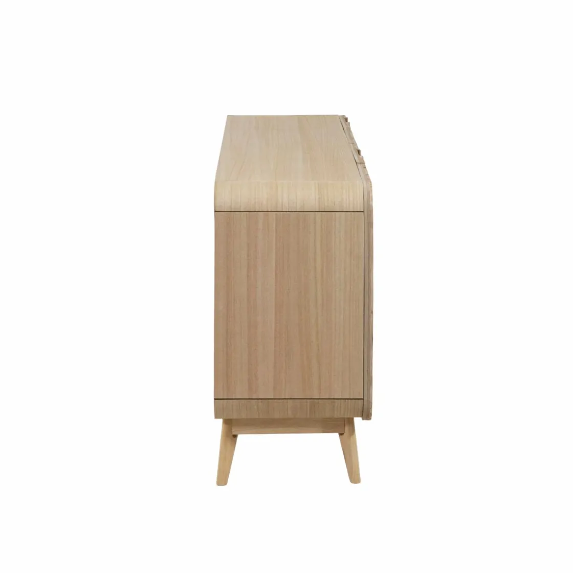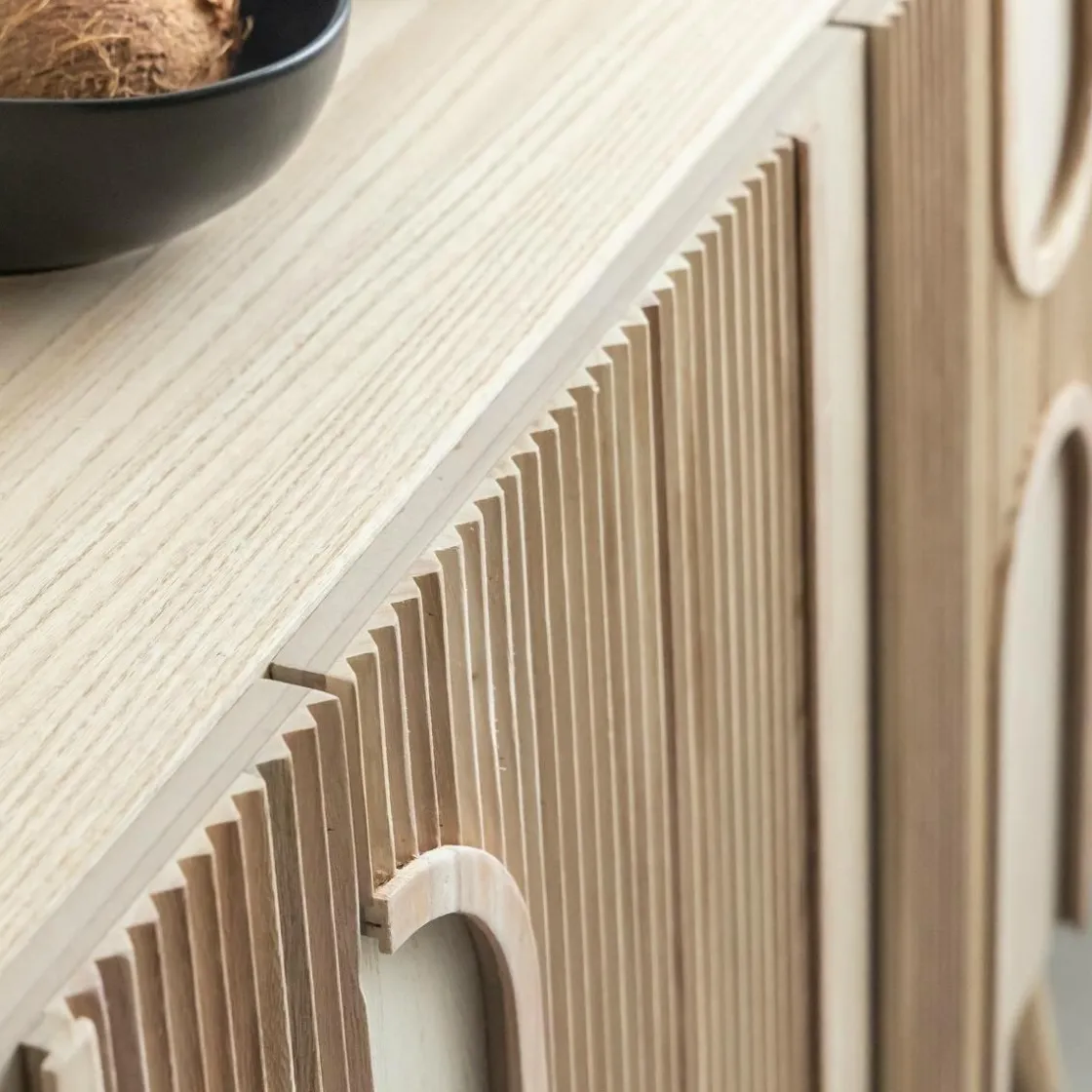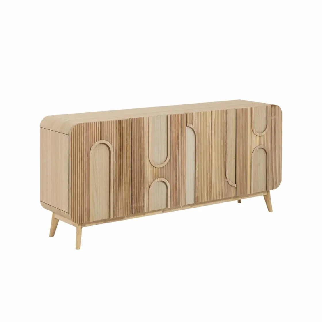 Ce buffet en bois de paulownia de la collection Nilo allie légèreté visuelle et originalité artistique. Sa teinte claire et lumineuse illumine l’espace, tandis que les motifs sculptés en relief sur les portes apportent une dimension graphique et contemporaine à ce meuble au charme singulier.