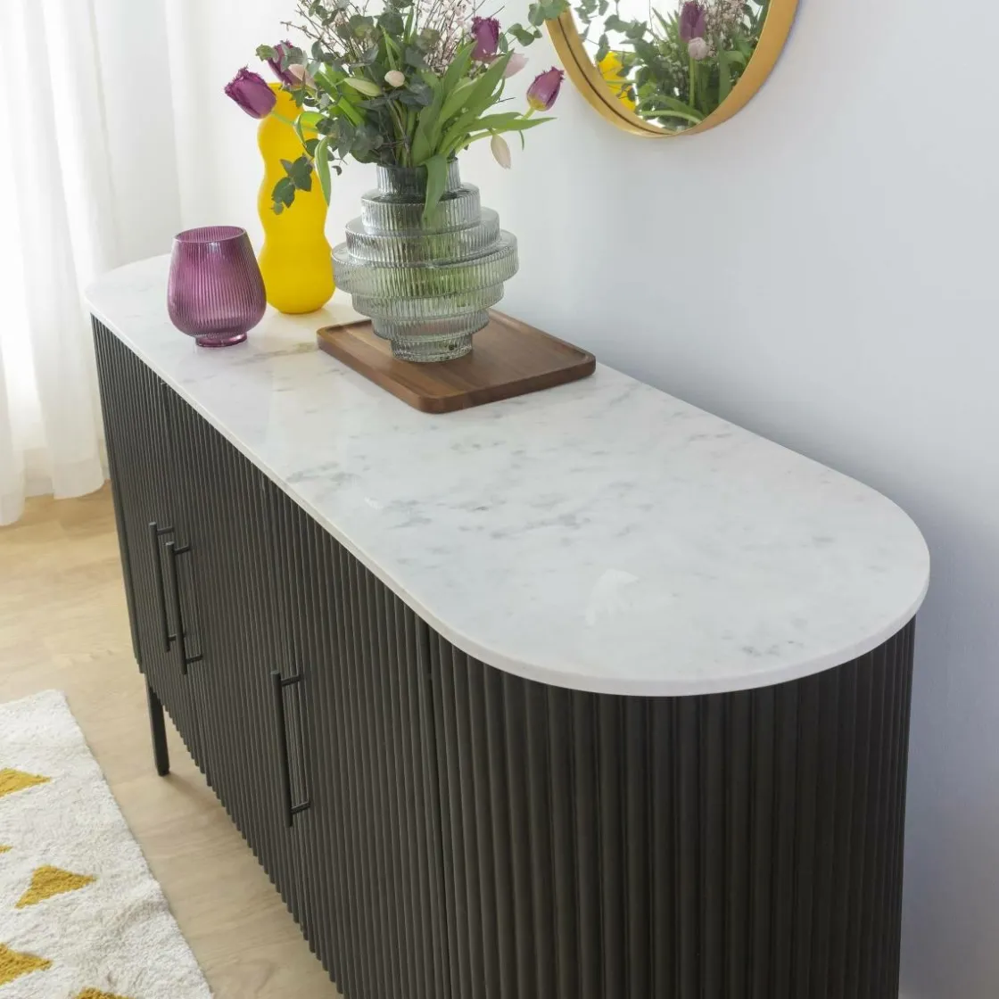 Ce buffet est un réel atout pour ranger votre vaisselle. Grâce à ses deux étages de 30cm, vous pouvez facilement organiser votre rangement. Sa forme ovale très originale présente une largeur de 160 cm et une hauteur de 81 cm, des mesures parfaites pour adopter ce buffet dans n’importe quelle pièce, qu’elle soit petite ou grande !