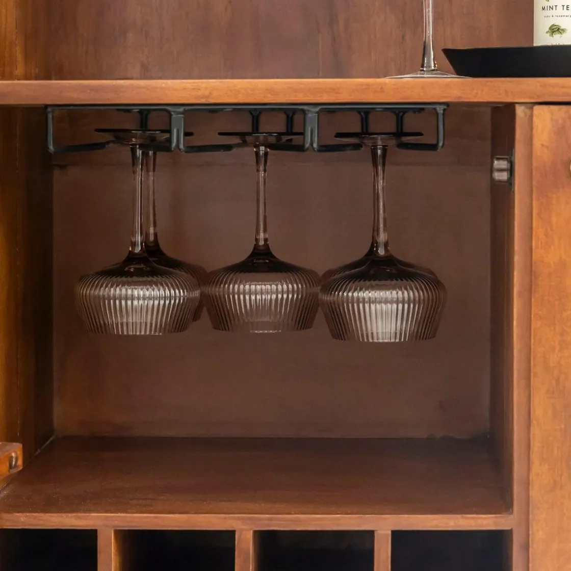 Ce meuble de rangement se compose de deux tiroirs supérieurs, d’une niche centrale ouverte idéale pour exposer verrerie ou objets déco, et d’un compartiment bas fermé par deux portes. Les poignées rondes dorées ajoutent une note chic à l’ensemble, contrastant avec la chaleur du bois d’acacia.