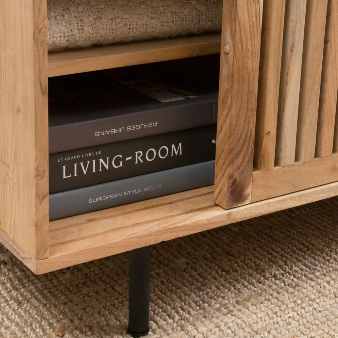 Coup de coeur assuré pour les façades de ses portes linéaires qui amènent de la douceur mais aussi un effet passe partout à ce meuble notamment grâce à ce design ajouré. Il s’adaptera dans n’importe quel style de décoration grâce aux nuances lumineuses de son bois.
