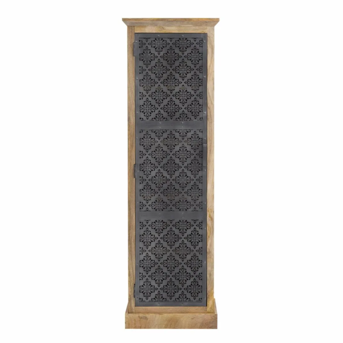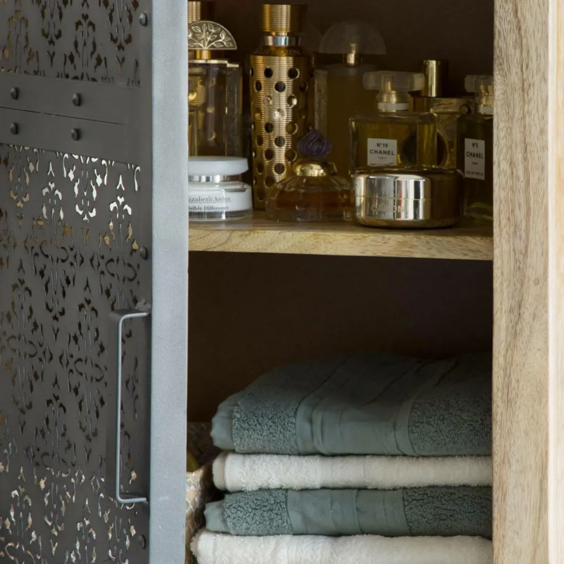 Cette colonne dispose d’un design bi-matière qui est très bien équilibré. Elle allie le bois de manguier, qui est un bois très lumineux au métal gris. Le métal est ajouré de façon à simplifier et alléger les traits parfois trop durs de ce matériau. On aime son design sublimé par de jolis motifs. Le choix des matériaux et des coloris est très bien dosé. Voici une très belle revisite de cette colonne !