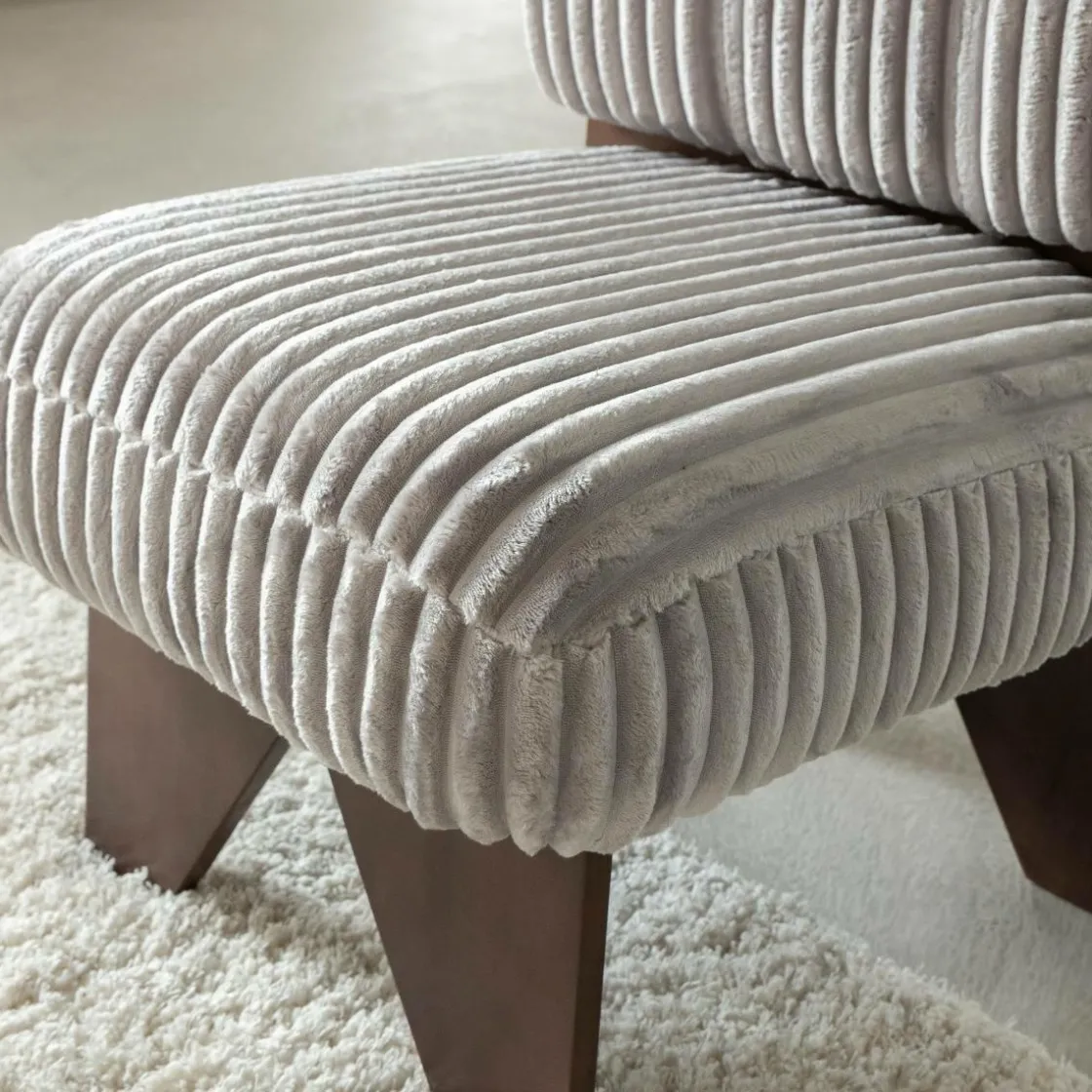 Sa structure en bois d’hévéa garantit robustesse et durabilité, tandis que son assise et son dossier en velours gris matelassé offrent une douceur agréable au toucher.