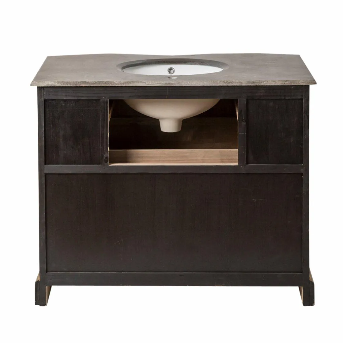 Ce meuble est fourni avec sa vasque. Livré en 2 parties : partie basse + plateau en pierre bleue de Chine avec vasque intégrée.