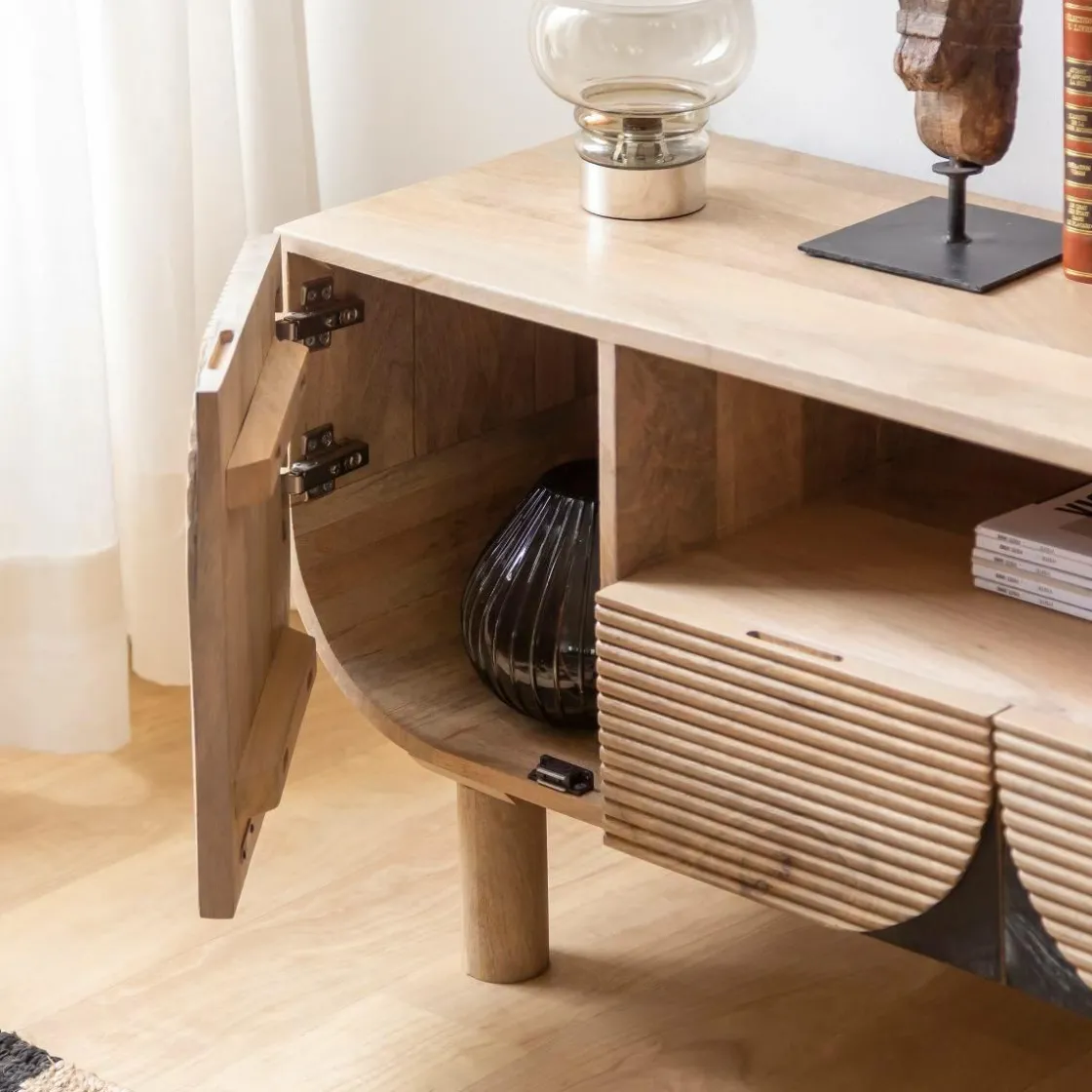 Le meuble TV Loëvan est un meuble emblématique qui met en valeur la beauté et la polyvalence du bois de manguier. Le design intemporel présente une forme classique avec des portes arrondies, créant un look délicat mais accrocheur. L’effet baguette ajoute au charme esthétique, faisant de ce meuble un complément attrayant à tout espace de vie.
