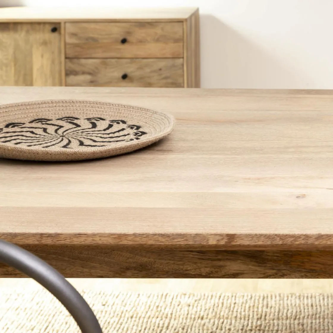 On n’hésite pas à l’accompagner de chaises en velours pour un rendu scandinave, ou encore de chaise en cuir roux pour un effet plus industriel ! Le bois de manguier est un bois très résistant qui vous apportera robustesse et résistance !