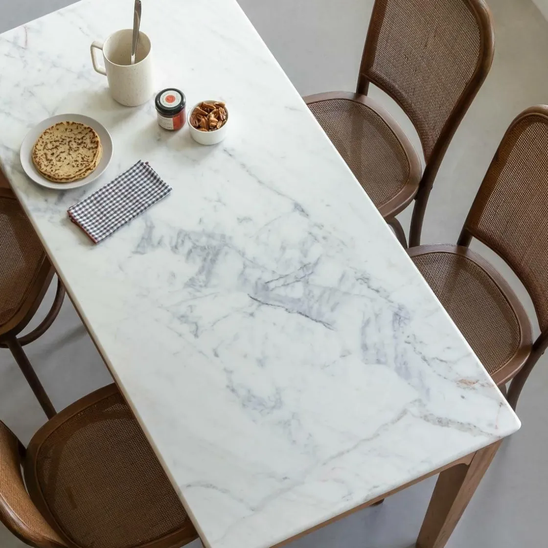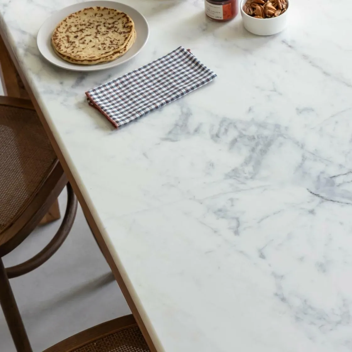 Chaque plateau en marbre est unique et présente ses propres caractéristiques. Veinage marqué, petites auréoles, ou nuances jaunies peuvent être des caractéristiques propres à cette pierre poreuse. N’hésitez pas à consulter notre article « Les spécificités du marbre blanc » sur notre blog pour plus de détails..
