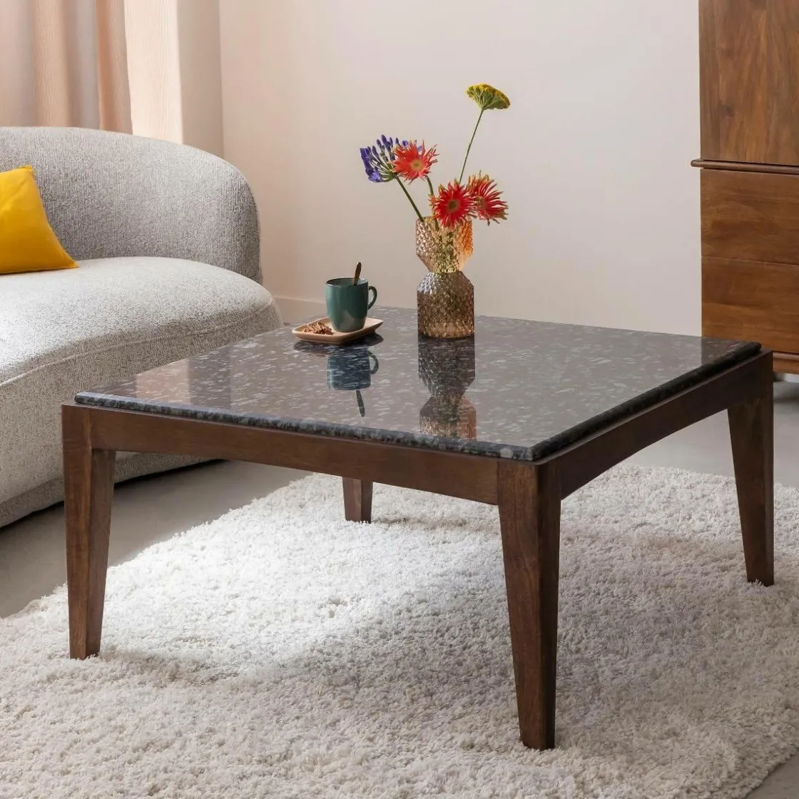 Raffinée et audacieuse, cette table basse carrée Ilithe en bois de manguier et marbre noir veiné se distingue par son élégance affirmée. Elle combine matériaux nobles et design sobre pour créer une pièce maîtresse dans tout salon contemporain.