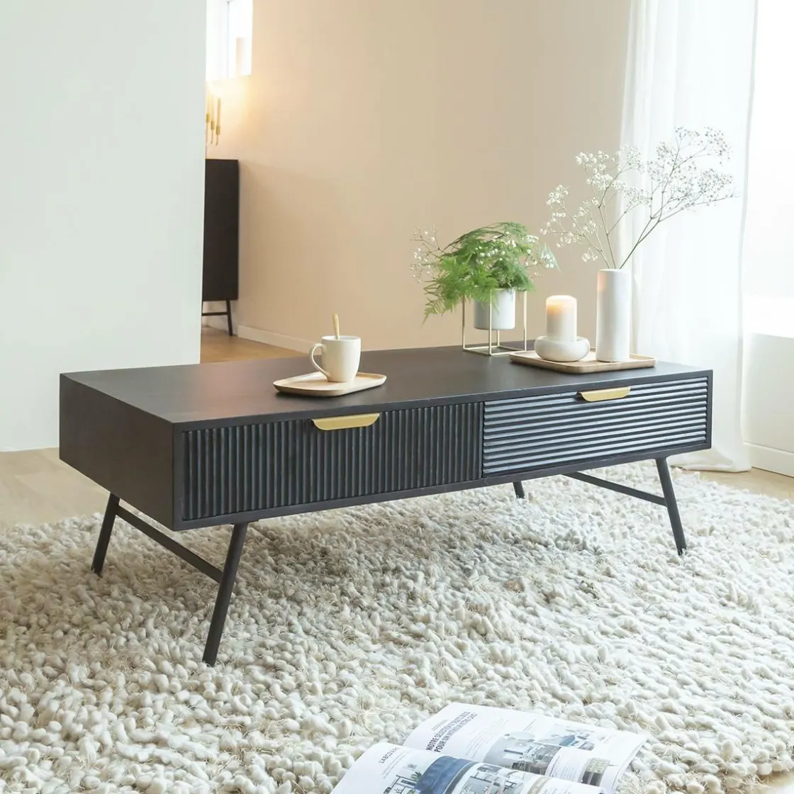 Côté rangements, cette table basse de style scandinave vous propose des solutions très avantageuses. Vous bénéficiez de 2 tiroirs en fer situés sur la face. Quoi de plus pratique pour y stocker vos objets du quotidien. Ainsi, vous pourrez y accéder facilement de votre canapé sans avoir à vous déplacer ! Vous pourrez profiter de son large plateau, de 120cm de largeur, pour y ajouter quelques objets de décorations. Cela vous permettra de personnaliser ce meuble original !
