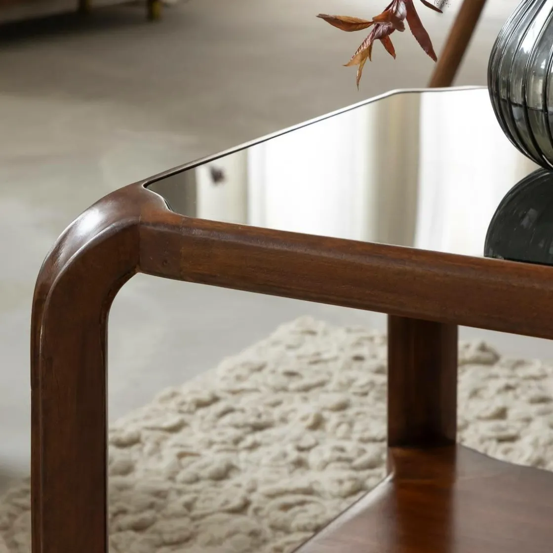 Fabriquée en bois de manguier de première qualité, elle présente un plateau en verre teinté noir qui ajoute une élégance subtile à son allure. Sa forme originale lui confère un caractère unique et captivant, faisant de cette table basse un véritable point focal dans votre salon.