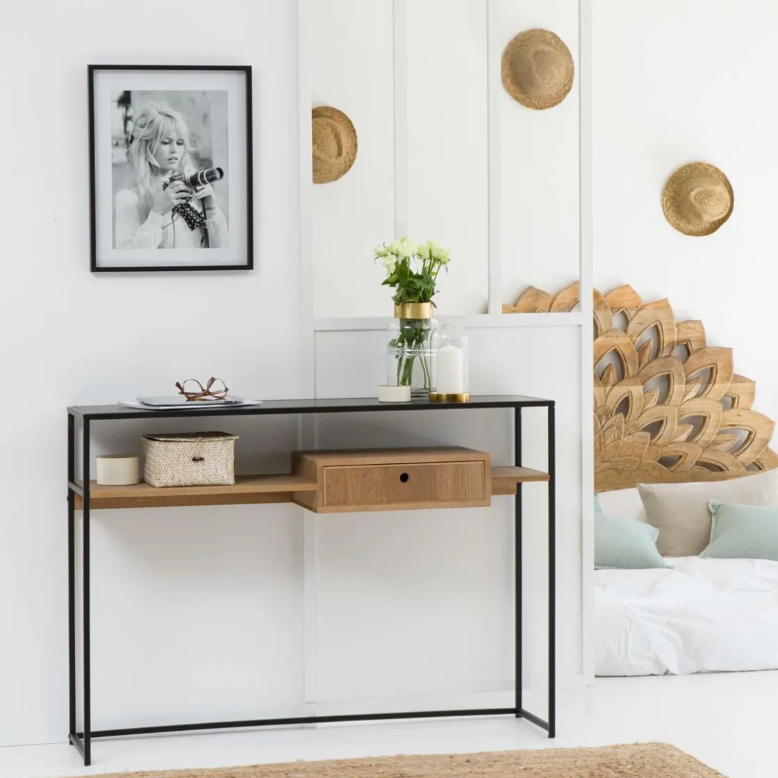 N’hésitez pas à disposer des petits paniers qui vous permettront d’organiser le rangement de vos clés, documents… Disposez-y plantes, déco, magazines, ou encore bouquins. Véritable accessoire de décoration, elle fait son petit effet !