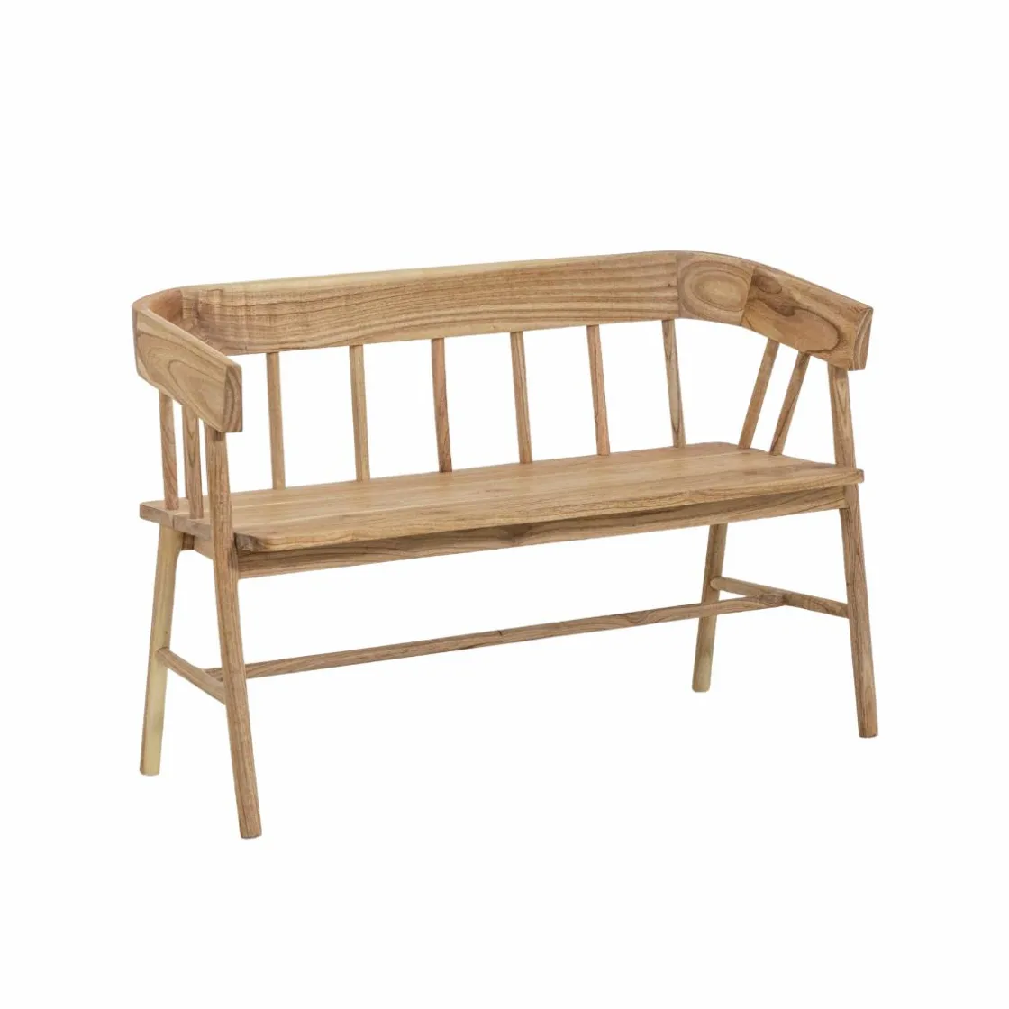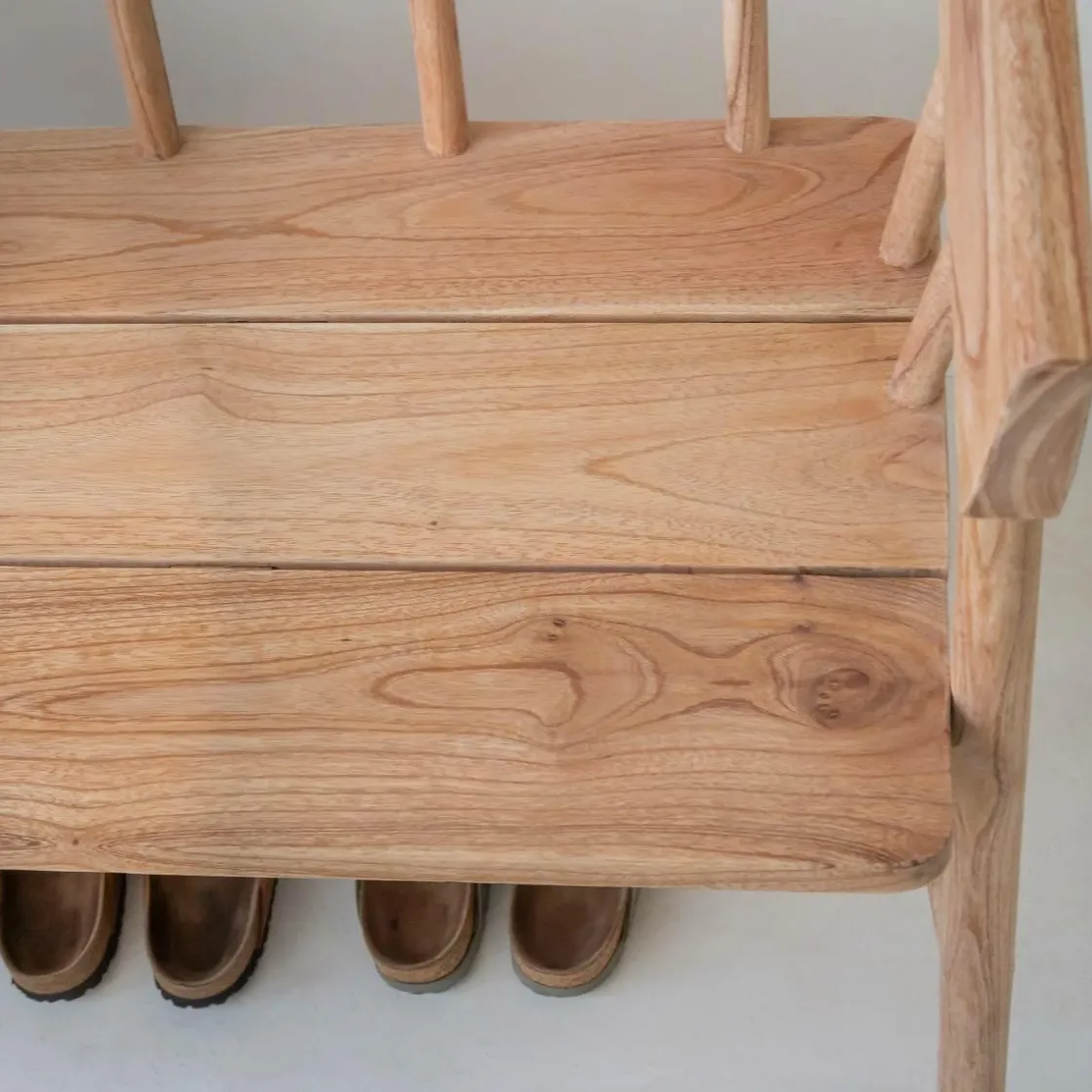 Ses accoudoirs intégrés et son assise spacieuse offrent un confort optimal, que ce soit autour d’une table de repas, dans une entrée ou en bout de lit. Sa finition brute met en valeur le veinage du teck, lui donnant un charme naturel unique.