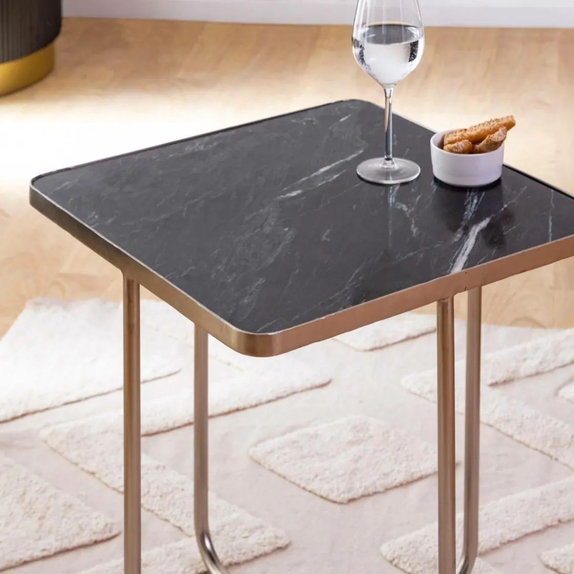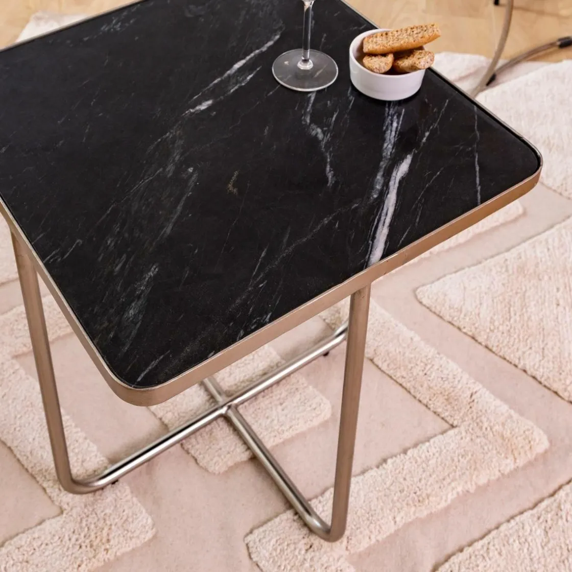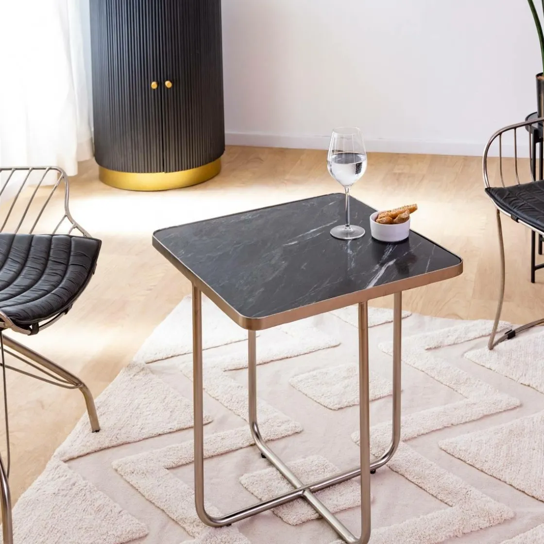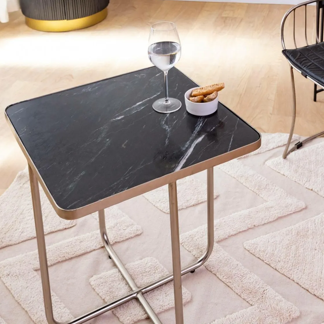 Dotée d’un superbe plateau en marbre et d’un cadre en métal doré, cette table d’appoint en forme d’art contemporain mettra en valeur n’importe quelle pièce, tout en remplissant sa fonction. Avec une hauteur de 56 cm et une largeur de 51 cm, ce meuble s’adaptera parfaitement à votre canapé ou à votre lampe.
