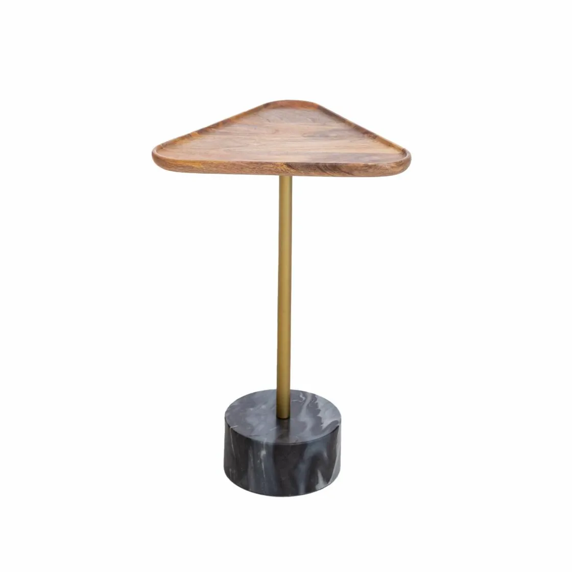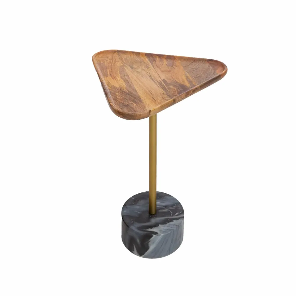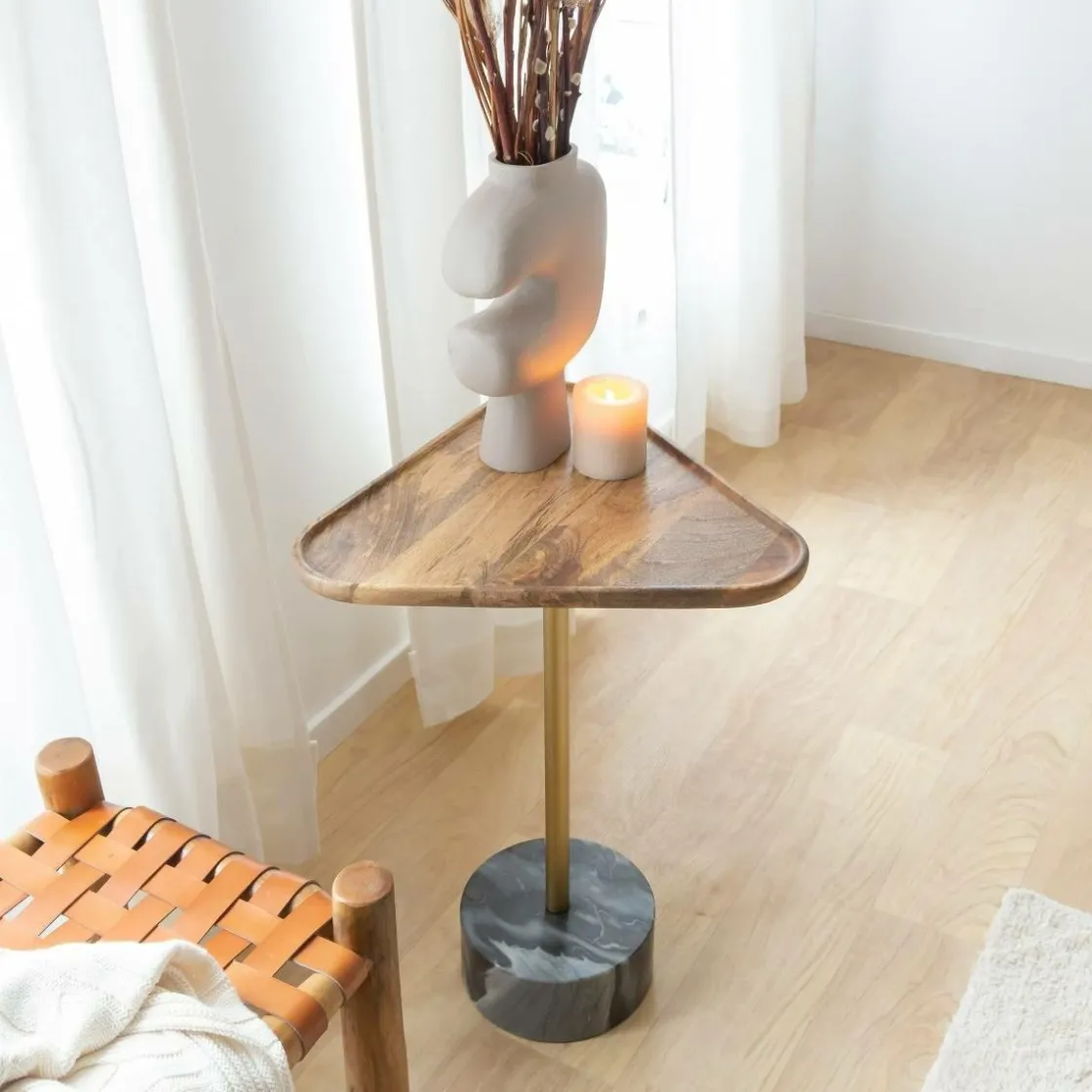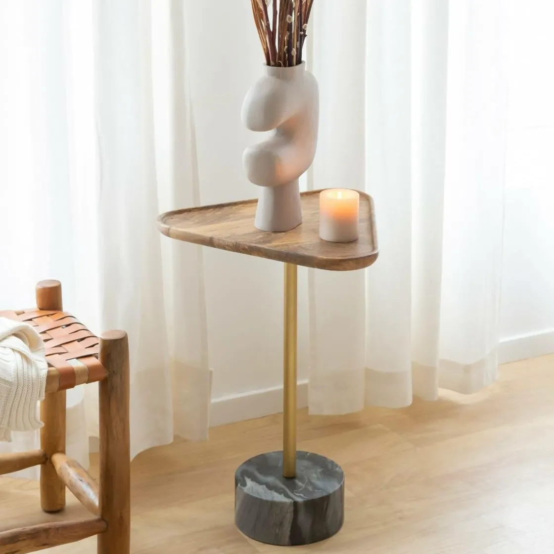 Trois matériaux sont assemblés pour créer le bout de canapé parfait. On développe : au niveau du plateau, on est sur un design triangulaire réalisé en bois de manguier. Au niveau du piétement, on est sur un socle massif réalisé en marbre gris. Une tige métallique dorée a été utilisée pour faire la jonction entre le plateau et le piétement. Ce piétement en marbre est la réelle valeur ajoutée de ce bout de canapé, il apporte une réelle élégance et en fait un accessoire de décoration de luxe.