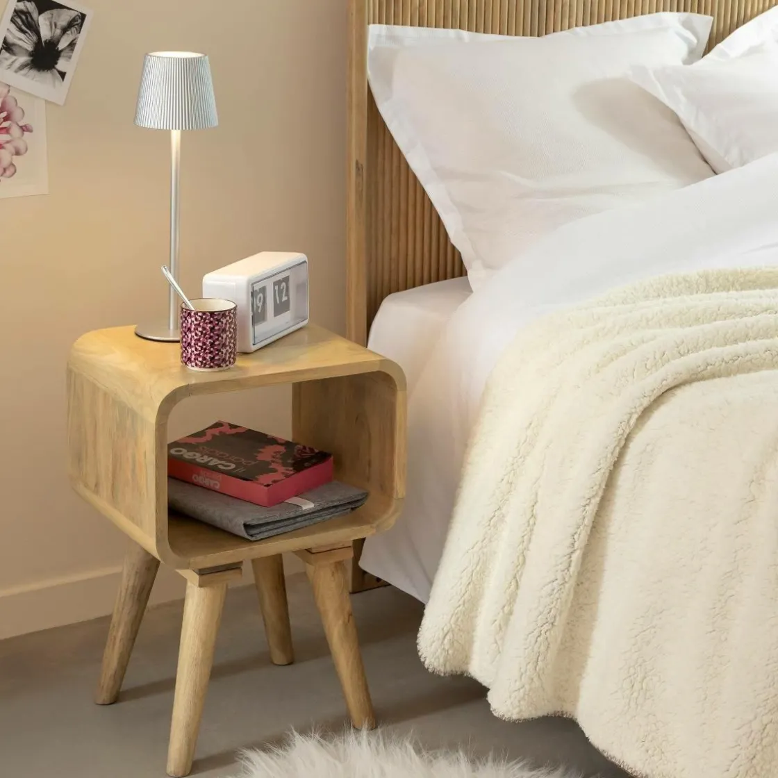 Apportez une touche naturelle et chaleureuse à votre chambre avec cette table de chevet en bois de manguier Maeva. Son design tout en rondeur et ses lignes épurées lui donnent un style à la fois vintage et intemporel. Dotée de quatre pieds légèrement évasés, elle assure une parfaite stabilité tout en affirmant un look rétro chic. Son grand compartiment central est idéal pour accueillir vos livres, magazines ou petits objets du quotidien, tout en restant facilement accessible.