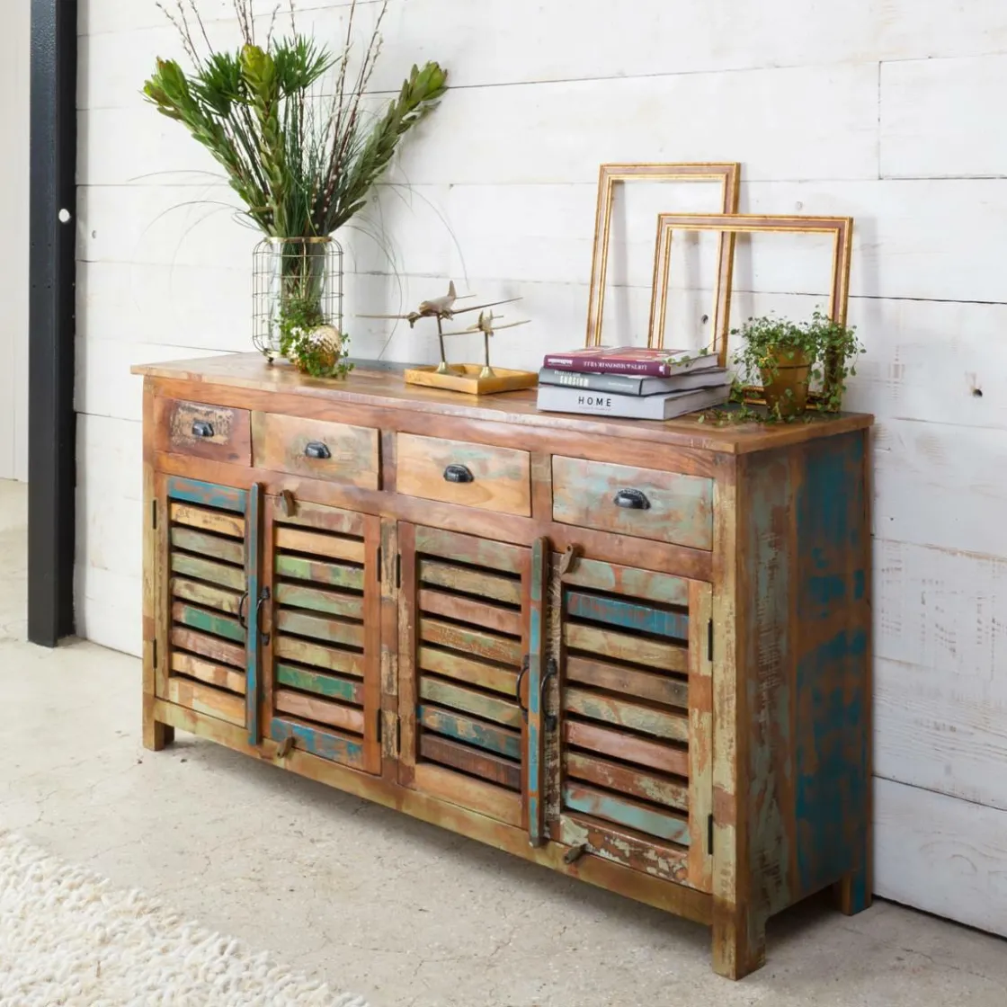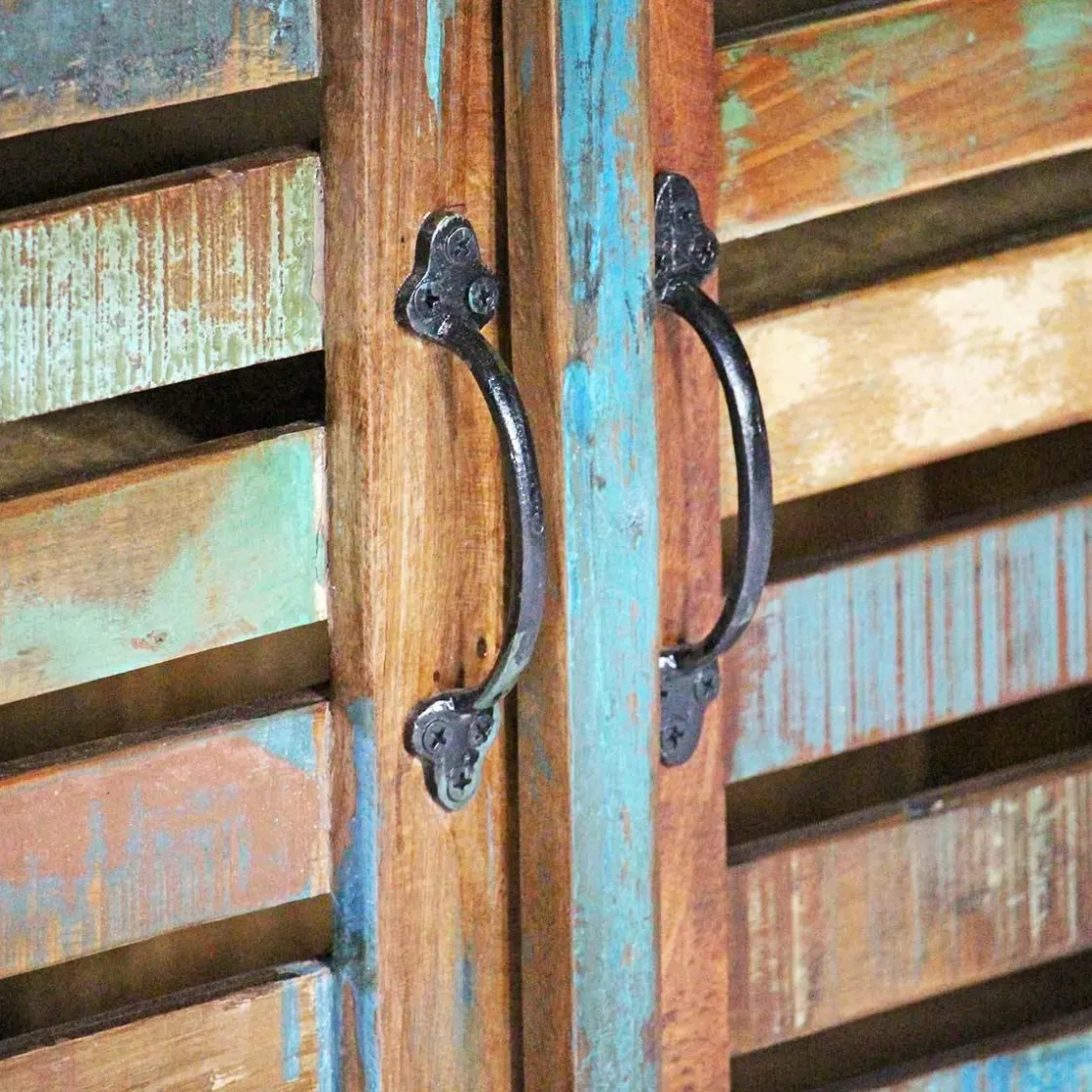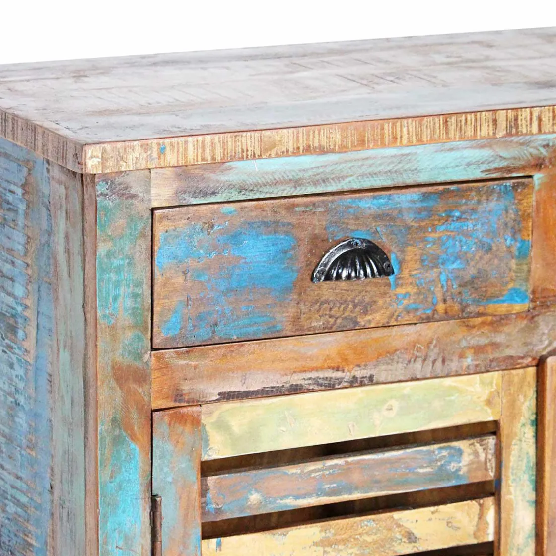 Le buffet enfilade en bois exotique à lattes recyclées est composé de 4 grandes portes et 4 grands tiroirs. Avec son espace de rangement très satisfaisant, vous pourrez ainsi stocker votre vaisselle, matériel ou tout autre objet de votre choix. L’authenticité apporté par le bois recyclé coloré de ce buffet bois massif fera de votre pièce un endroit chaleureux et unique.