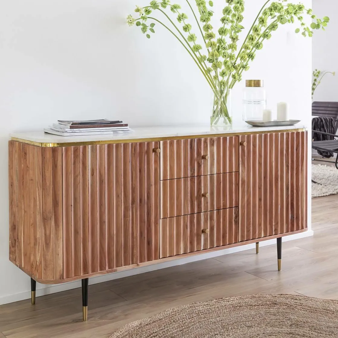 Ce buffet bois massif est totalement dans l’air du temps grâce à son design arrondi, ce style est très apprécié et se répand à une vitesse folle dans nos intérieurs… pour notre plus grand plaisir bien sûr ! On aime aussi le design tout en relief sur les façades de portes qui apporte une touche d’originalité au meuble.