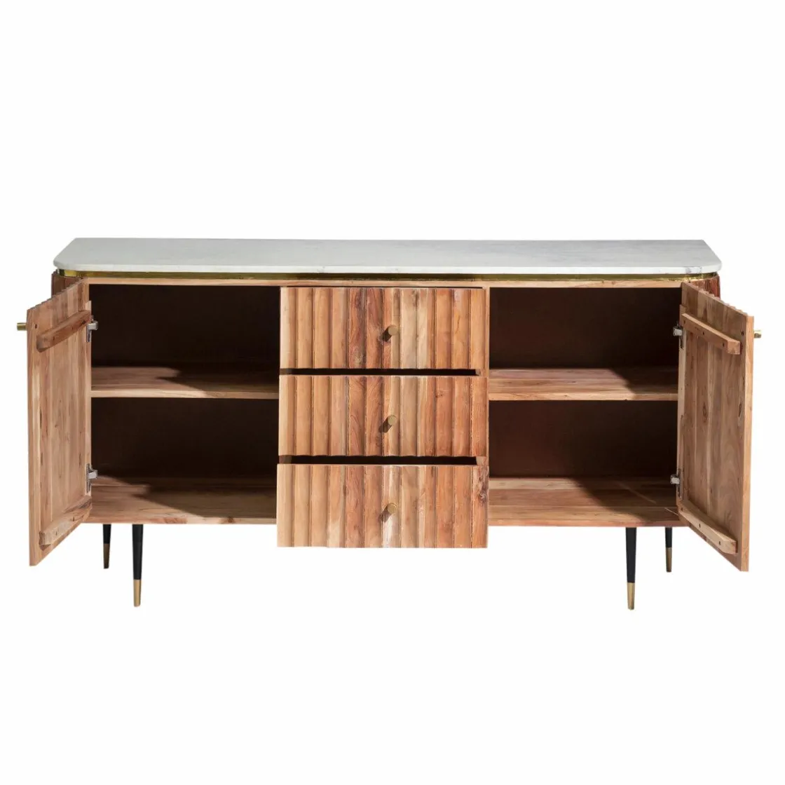 Côté rangement, il vous propose 2 portes derrière lesquelles se cachent un bel espace de rangement organisé à l’aide d’une étagère, ainsi que 3 tiroirs centraux. Le bois d’acacia a été choisi pour sa robustesse et ses nuances lumineuses. Le plateau en marbre affirme le côté intemporel du meuble et en fait un indispensable qui se transmettra de générations en générations.