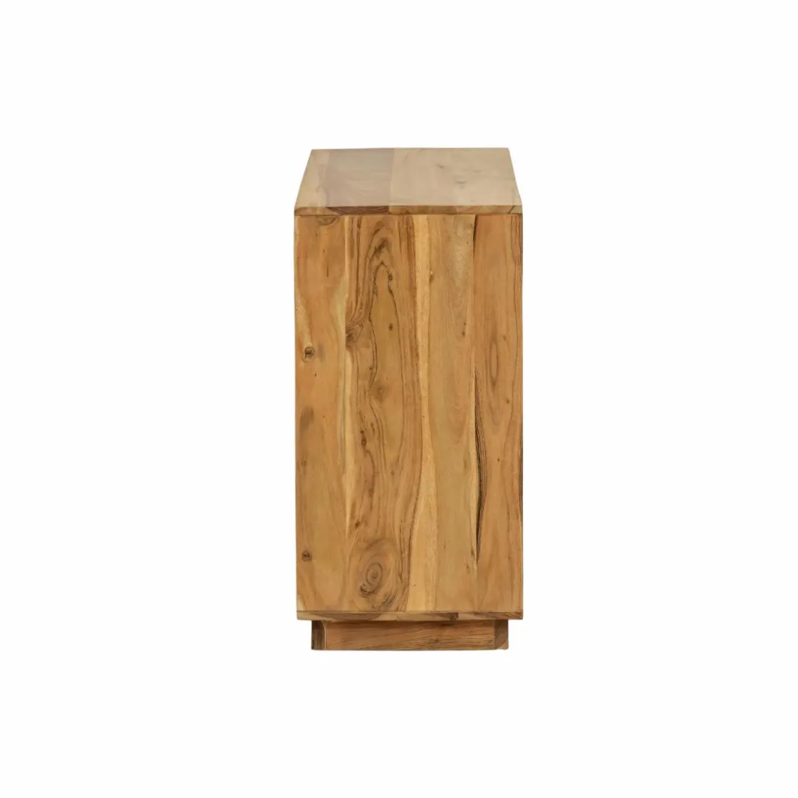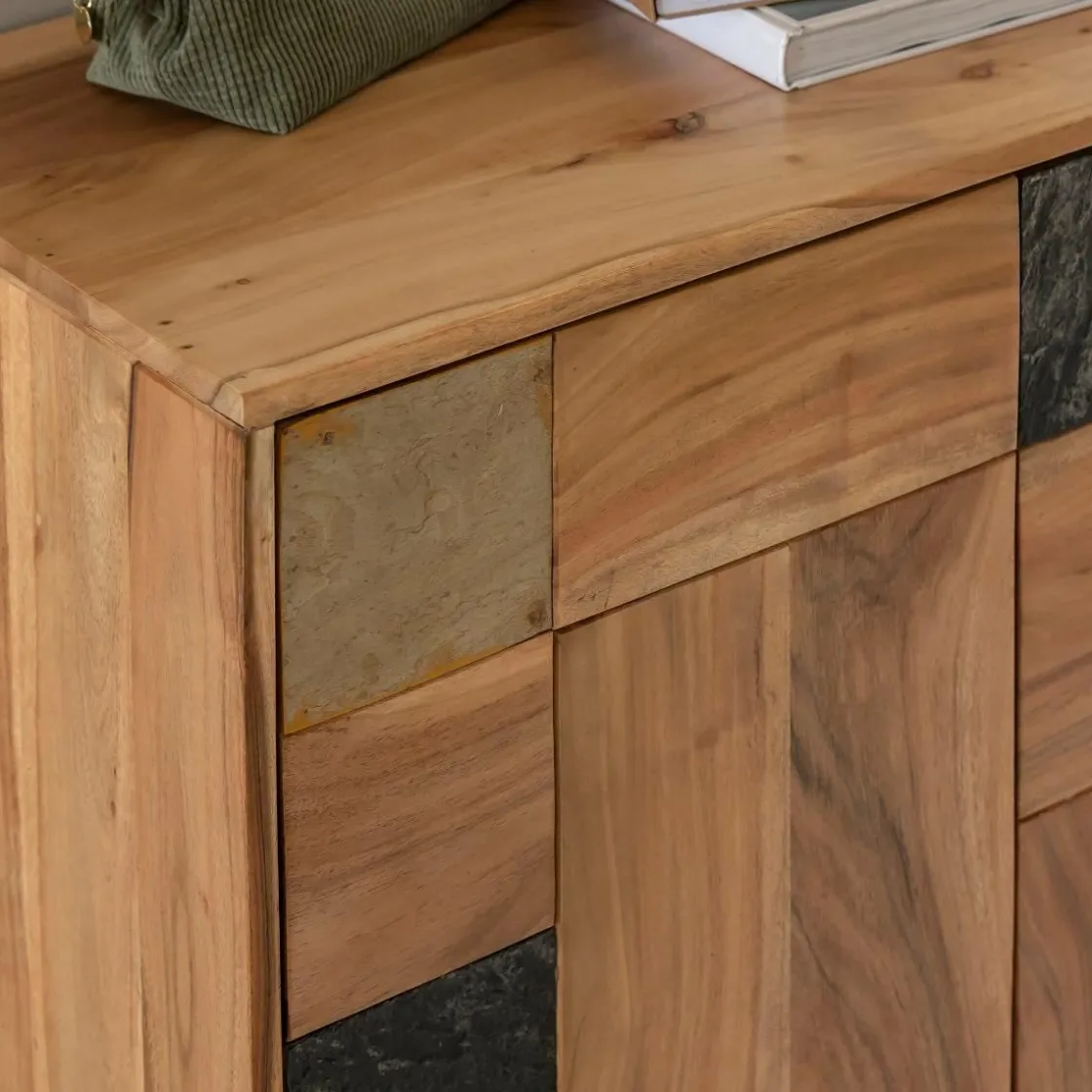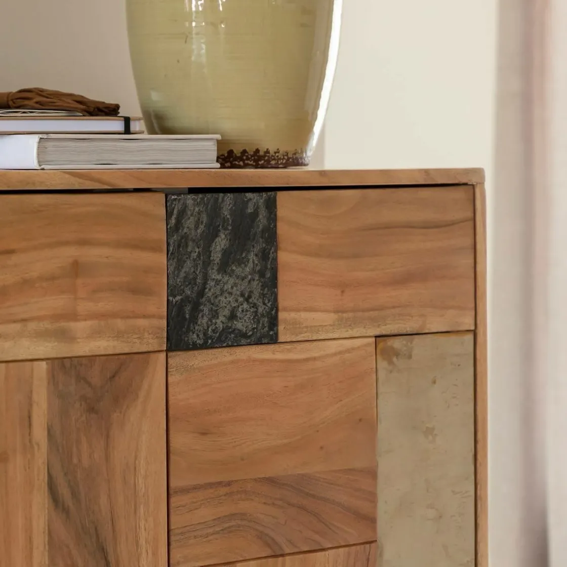 Ce buffet en acacia massif se démarque par son design original en façade patchwork, associant des panneaux de bois aux veinages variés et des touches de teintes minérales pour un rendu graphique et moderne. Chaque élément semble assemblé comme un jeu de matières, créant un effet visuel structuré et dynamique.