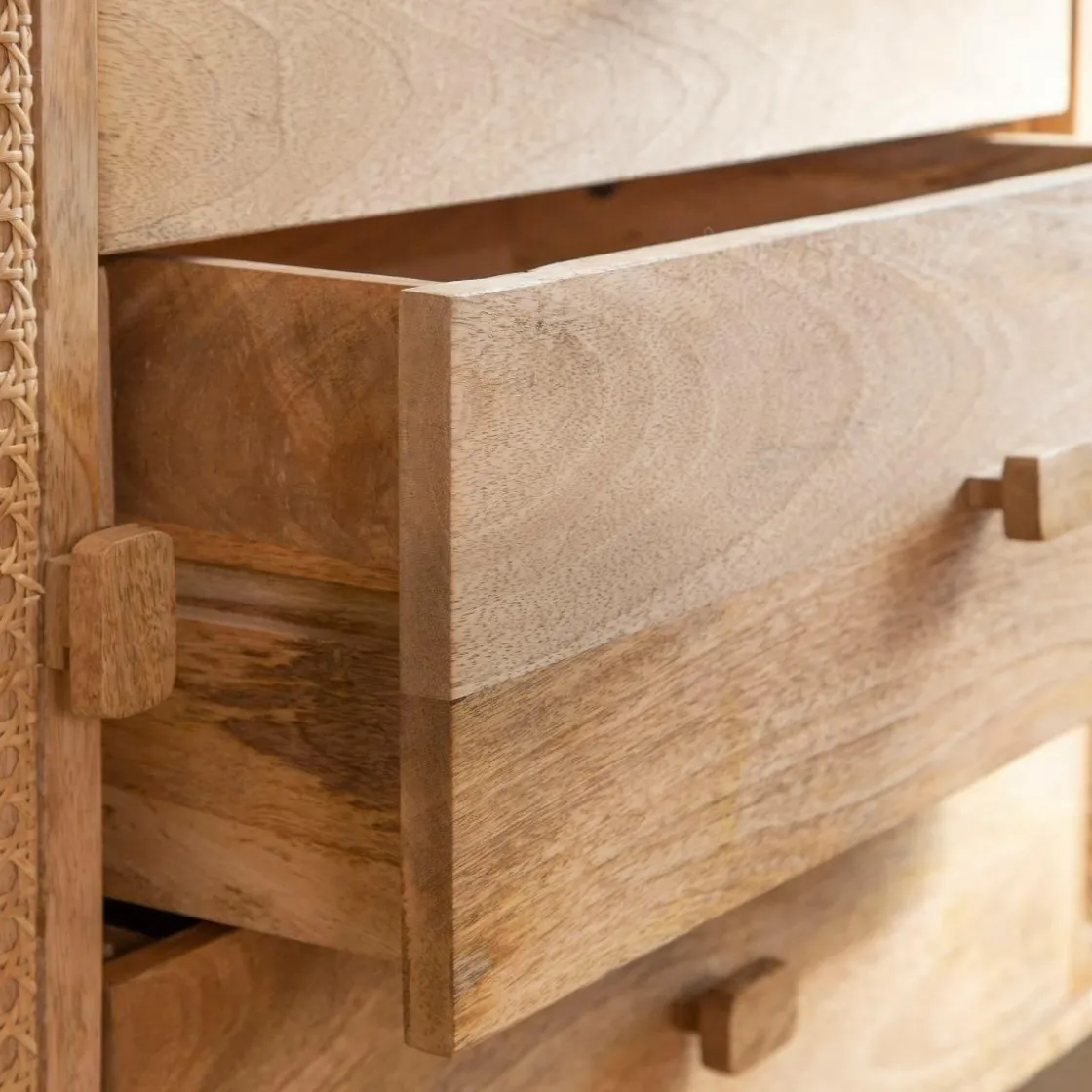 Le bois de manguier donne un ton séduisant à cette charmante pièce, tandis que le cannage ajoute une texture supplémentaire et un attrait visuel, créant une atmosphère chaleureuse où qu’elle se trouve. Apportez de la chaleur et de la beauté à votre intérieur avec ce superbe buffet Palma en bois de manguier et en rotin !