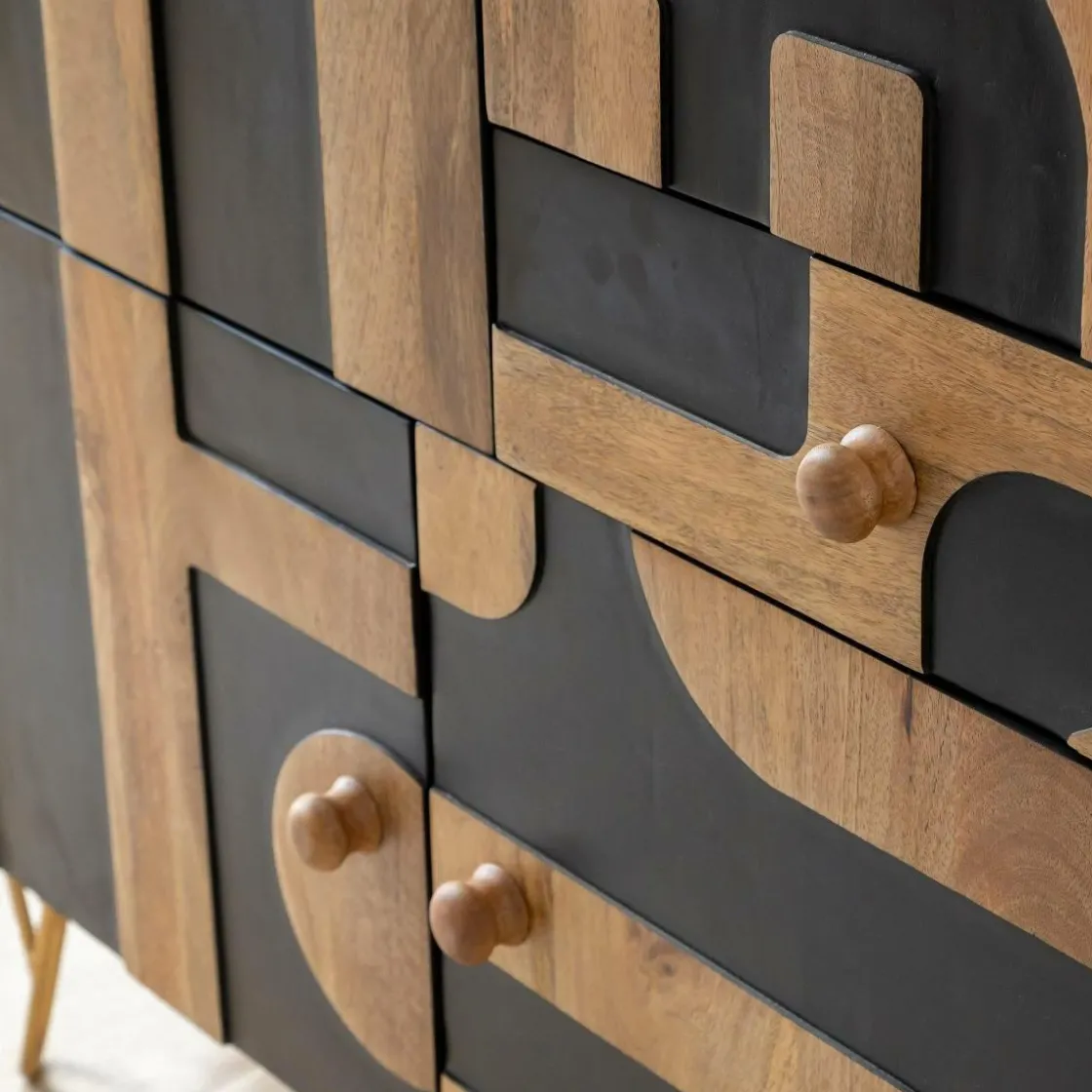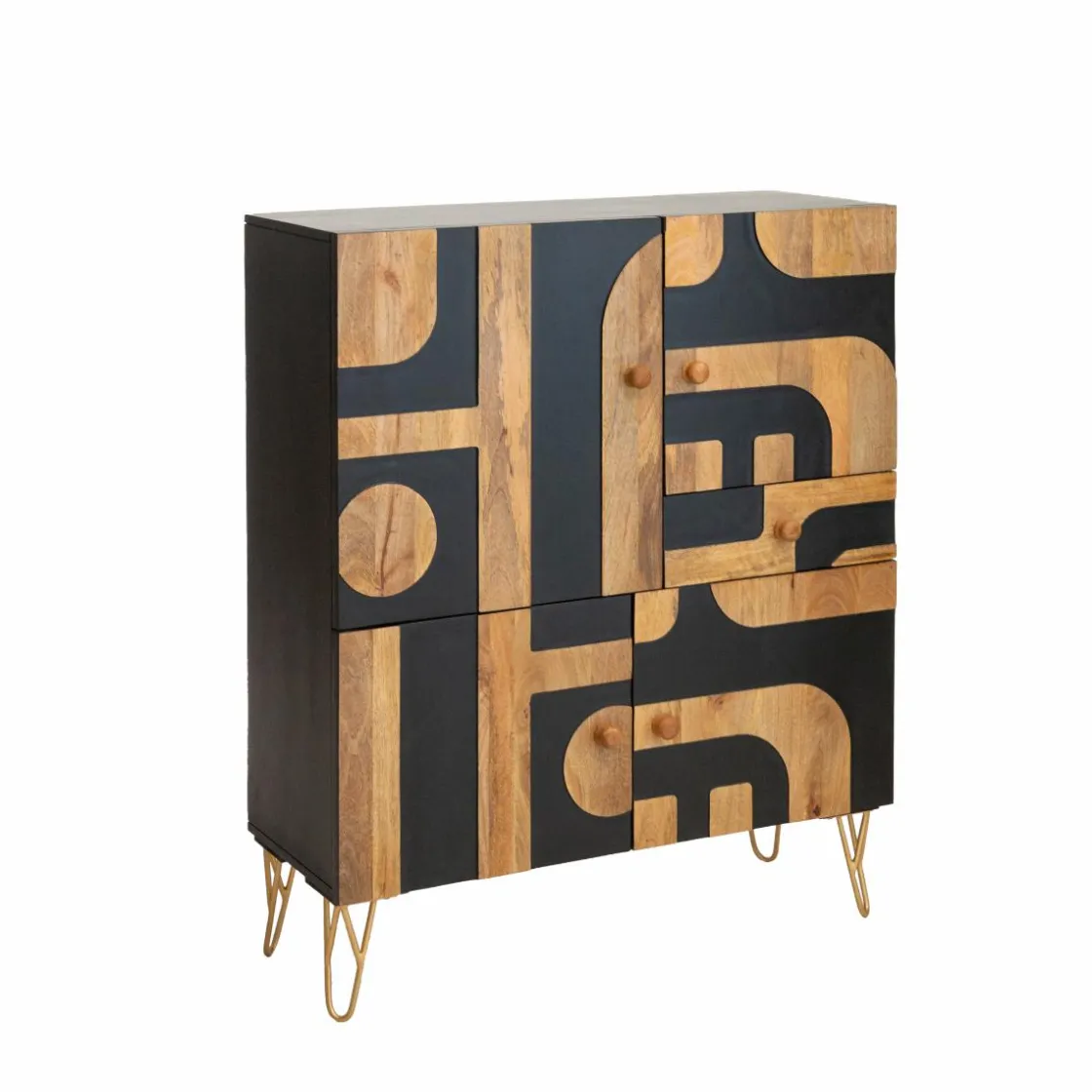 Avec une hauteur de 120 cm et une largeur de 100 cm, il offre cinq espaces de rangement distincts derrière des portes ornées de charmants motifs géométriques noirs. Son design contemporain et élégant en fait le complément idéal pour améliorer votre décoration intérieure et ajouter de la sophistication à n’importe quel espace.