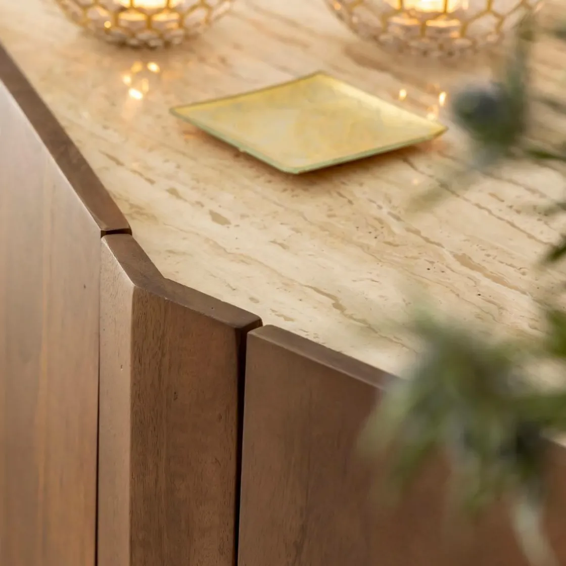 Le Buffet en bois de manguier et travertin Azure est une œuvre d’art qui marie élégance authentique et design scandinave. Composé de bois de manguier foncé et de travertin, il infuse sophistication et chaleur dans votre espace tout en conservant une allure moderne et épurée.