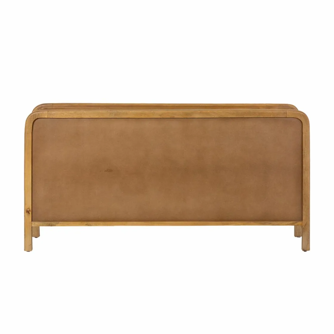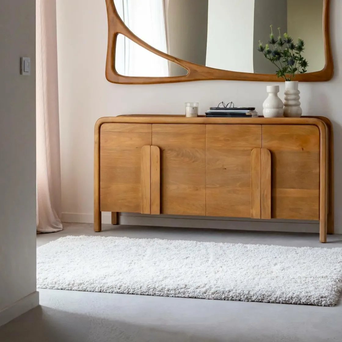 Ce buffet en bois de manguier de la collection Féodor séduit par sa silhouette toute en courbes et son design fluide inspiré des formes organiques. Les angles arrondis, les pieds galbés et les poignées sculptées dans la continuité des façades créent une esthétique douce et contemporaine, parfaitement équilibrée. Le bois de manguier massif, aux tons clairs et chaleureux, souligne l’élégance artisanale du meuble.