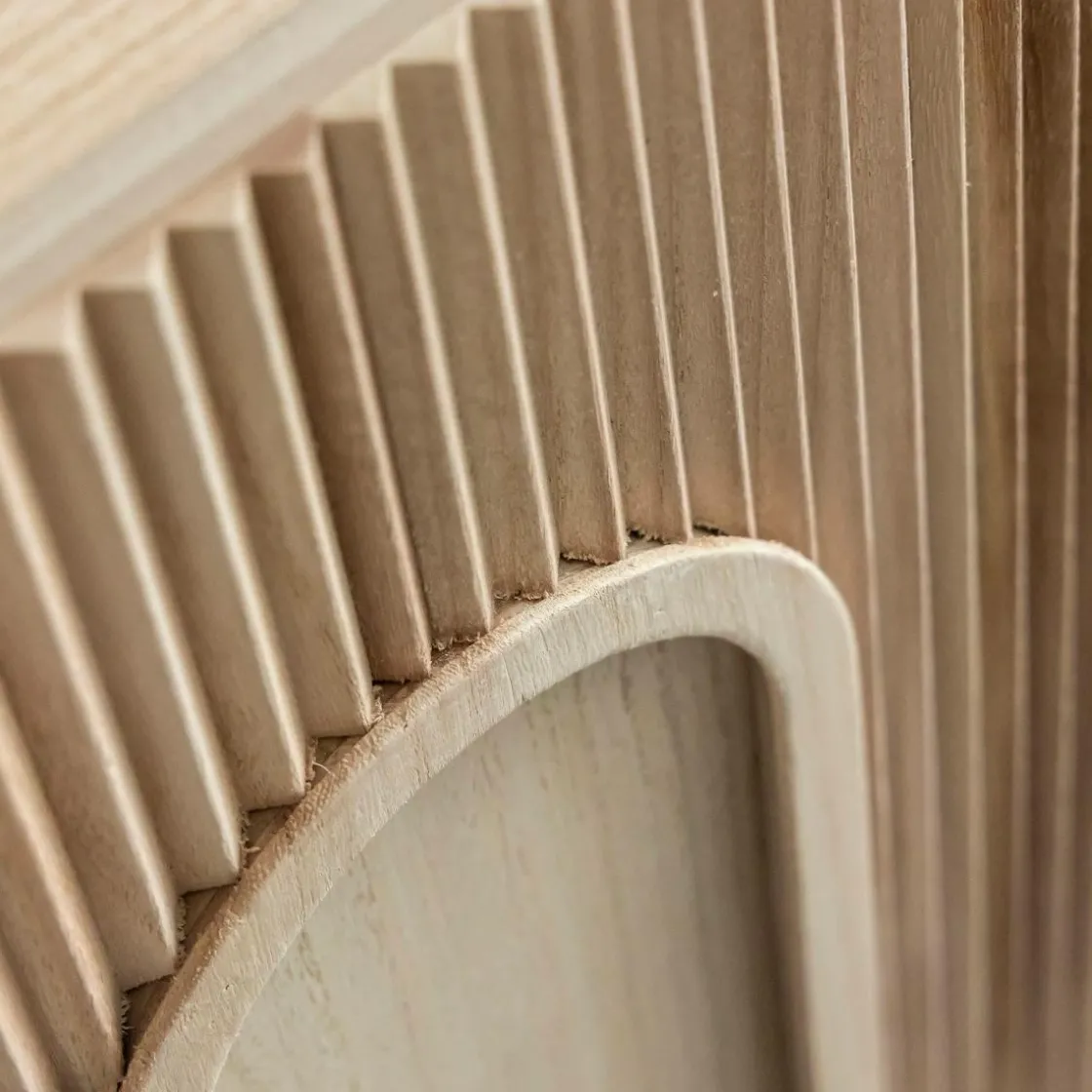 Ce buffet en bois de paulownia de la collection Nilo allie légèreté visuelle et originalité artistique. Sa teinte claire et lumineuse illumine l’espace, tandis que les motifs sculptés en relief sur les portes apportent une dimension graphique et contemporaine à ce meuble au charme singulier.