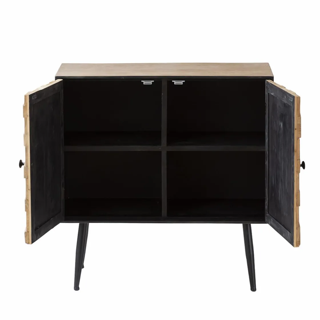 Ce buffet bois massif sera un incontournable dans l’aménagement de votre intérieur. Il va monopoliser l’attention grâce au motif de ses portes qui donne un réel effet dynamique à l’ensemble du meuble. La structure du meuble est constituée de bois de sapin tandis que son piètement est fait de métal noir. Ces matériaux confèrent à ce buffet une solidité sans égale. Vous avez très certainement remarqué les pieds au design compas qui rappel la tendance scandinave. C’est un réel atout, car vous pourrez aussi bien intégrer ce buffet dans un intérieur au style industriel que scandinave.