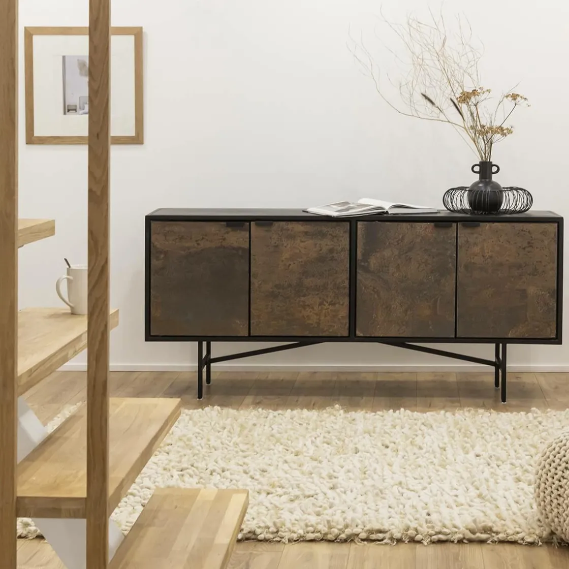 Conçu à partir de matériaux de qualités, ce buffet industriel possède des nuances qui font de lui un meuble unique. Les façades de ses portes possèdent un effet rouille que vous ne retrouverez sur aucun autre meuble. Cela vous permettra de disposer cette pièce aussi bien dans une ambiance industrielle que vintage. Apporter une touche d’originalité vous permettra d’obtenir un intérieur original et unique. Vous retrouverez une structure en métal, au niveau du plateau et du dos du meuble, du contour et des pieds. Ainsi, vous disposez d’un buffet industriel imposant tout en étant assez léger.