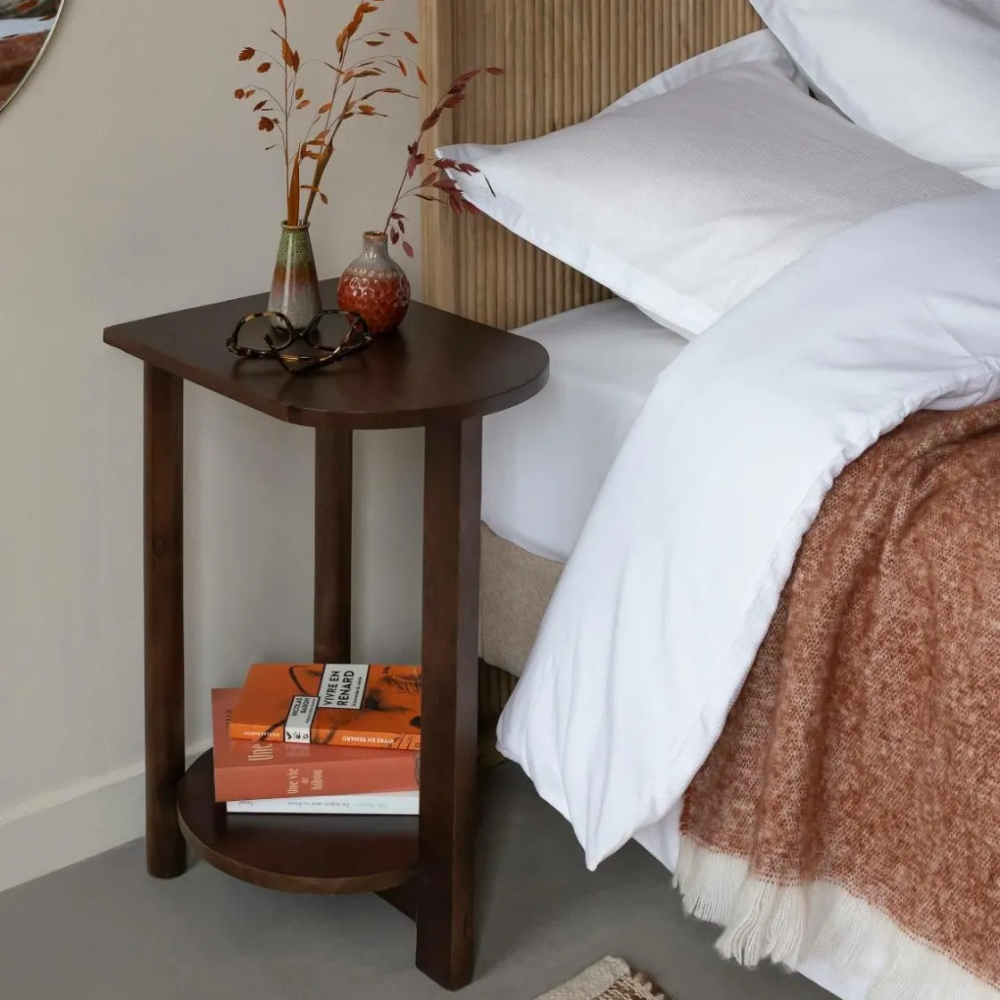 Fonctionnelle, elle dispose d’une surface supérieure idéale pour poser lampe ou objets du quotidien, ainsi que d’une tablette ronde en partie basse pour un rangement supplémentaire. Compacte et pratique, cette table de chevet allie esthétique et utilité pour compléter harmonieusement l’espace nuit.