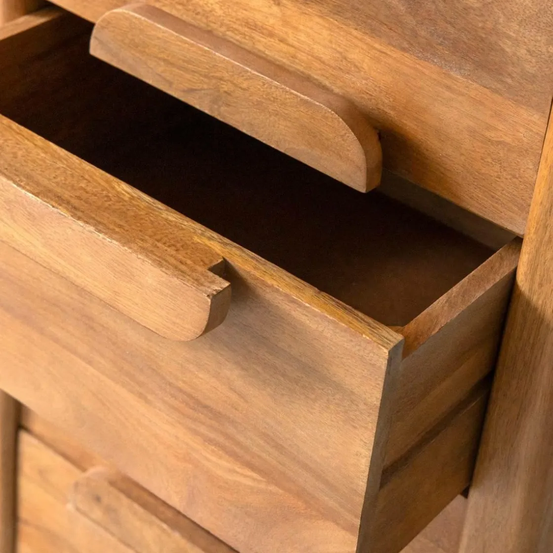 Ce chiffonnier en bois de manguier de la collection Féodor allie parfaitement lignes douces et fonctionnalité. Avec ses coins arrondis, ses pieds fins et ses poignées sculptées dans la continuité des tiroirs, il reprend les codes organiques de la collection pour offrir un design à la fois apaisant et contemporain. Le bois de manguier, aux nuances chaleureuses et authentiques, met en valeur le travail soigné des courbes et des finitions.
