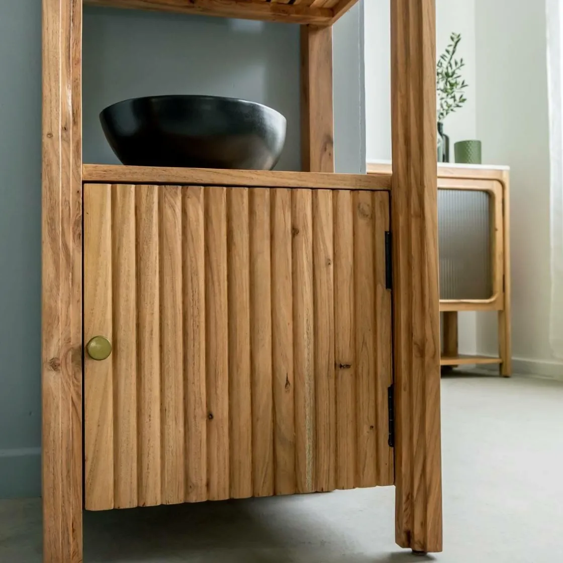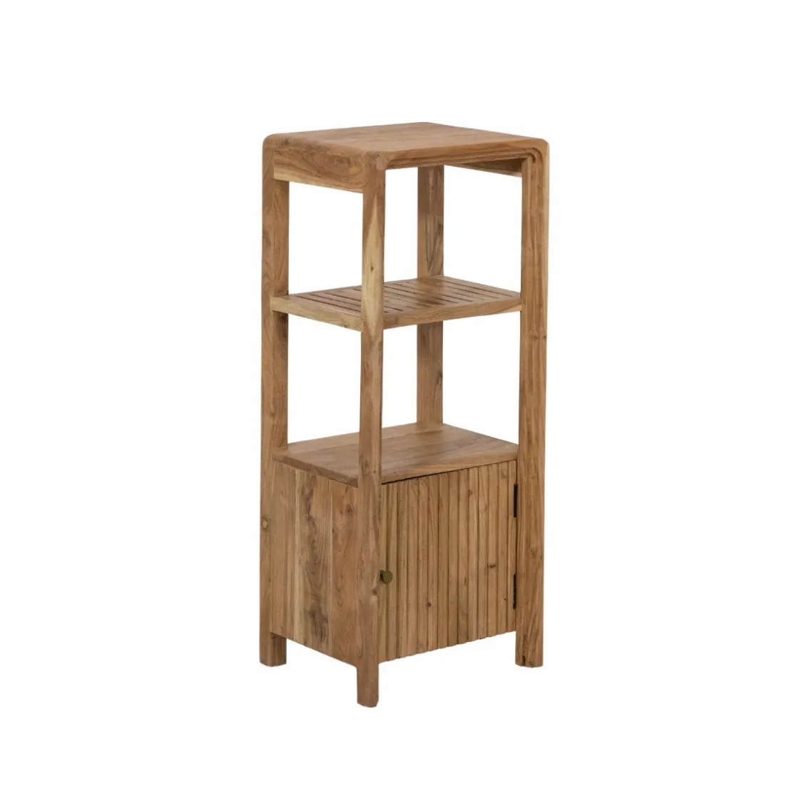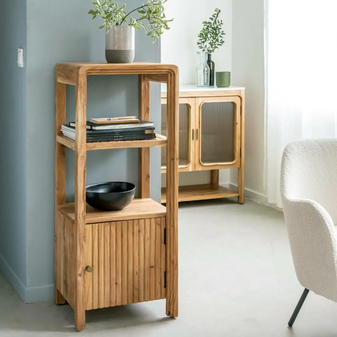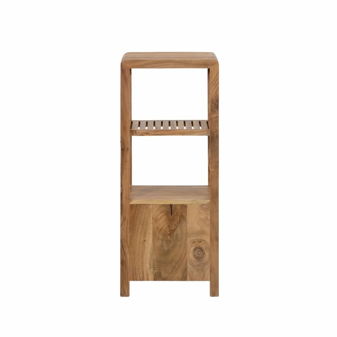 Cette colonne en bois d’acacia de la collection Emyr allie lignes douces et fonctionnalité, parfaite pour meubler un petit espace avec style. Son design aux angles arrondis adoucit la silhouette verticale du meuble, tout en mettant en valeur les nuances chaleureuses et le grain vivant du bois d’acacia massif. Un format compact qui maximise la capacité de rangement sans encombrer visuellement.