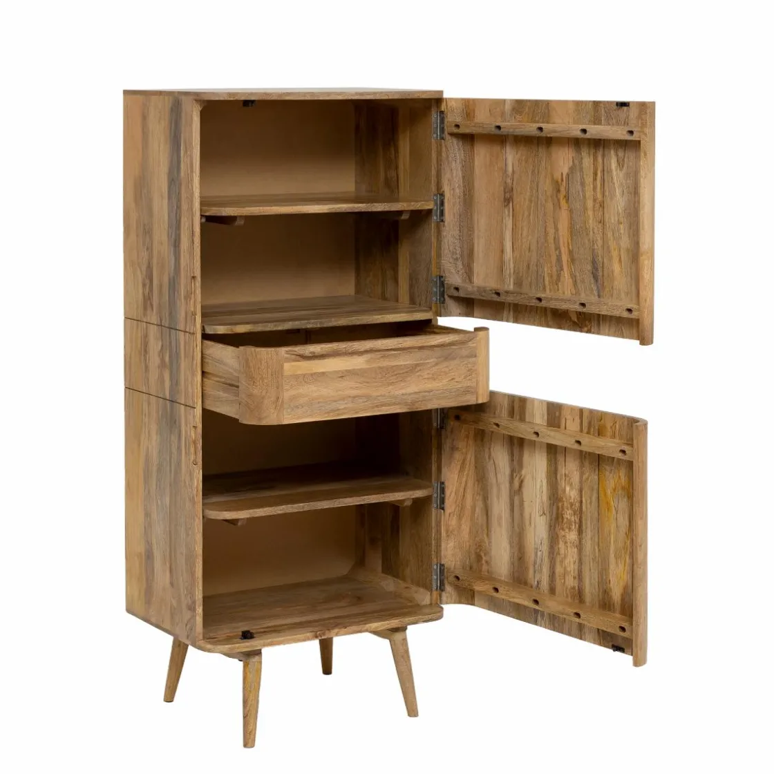 La colonne Aléna incarne le mariage parfait entre le style scandinave et contemporain. Fabriquée en bois de manguier, elle offre deux portes de rangement et un tiroir central, offrant ainsi une solution pratique pour organiser vos objets essentiels.