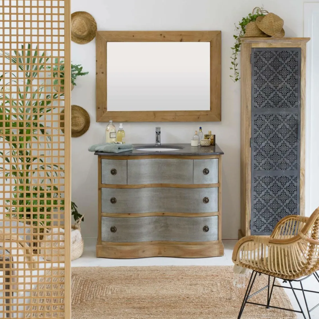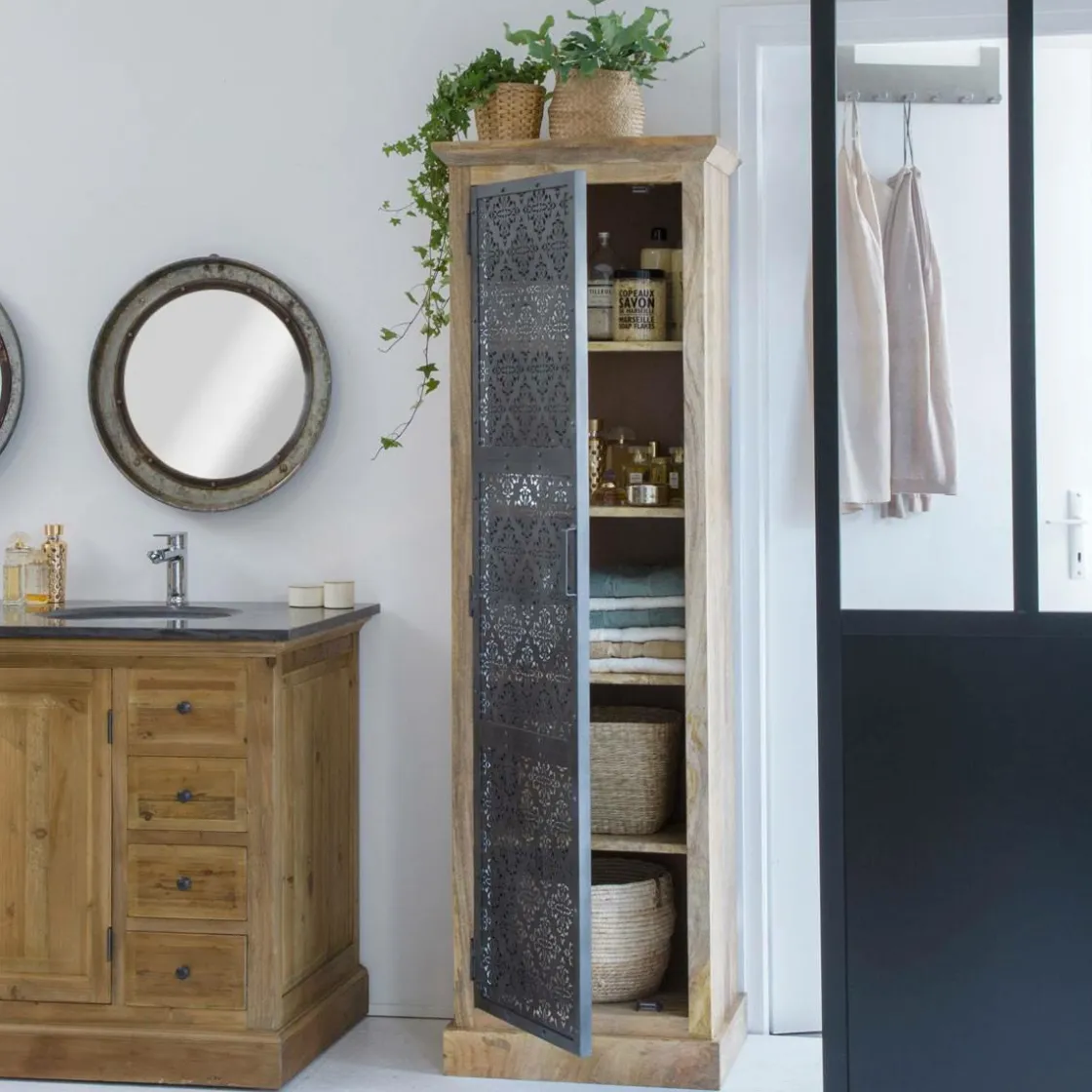Cette colonne dispose d’un design bi-matière qui est très bien équilibré. Elle allie le bois de manguier, qui est un bois très lumineux au métal gris. Le métal est ajouré de façon à simplifier et alléger les traits parfois trop durs de ce matériau. On aime son design sublimé par de jolis motifs. Le choix des matériaux et des coloris est très bien dosé. Voici une très belle revisite de cette colonne !