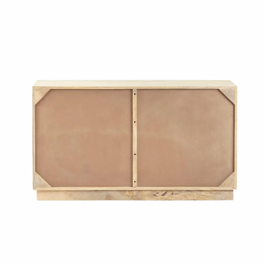 Cette commode de la collection Lioris incarne à la fois authenticité et originalité. Réalisée en bois de manguier massif, elle met en valeur les nuances naturelles et chaleureuses de ce bois exotique réputé pour sa robustesse. Son design se distingue par ses façades décorées de bandes cloutées, apportant une touche artisanale et singulière qui lui confère un véritable cachet.