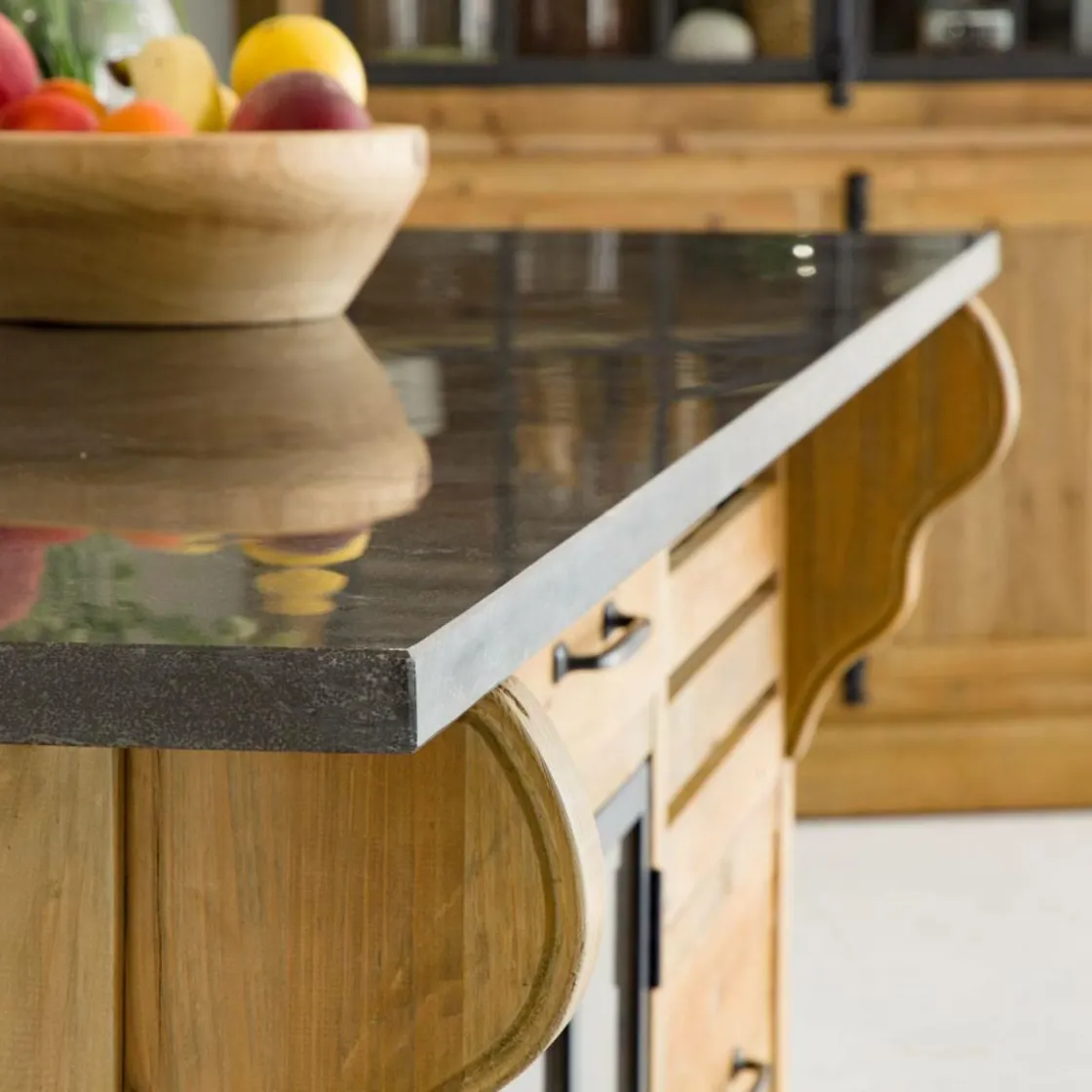 Constitué en vieux pin recyclé, cet îlot dispose d’une pierre bleue naturelle de Chine qui est placée sur le plan de travail. La qualité des matériaux a été sélectionnée afin de vous offrir un produit qui vous accompagnera durant de nombreuses années. Sa structure dispose de finitions irréprochables.