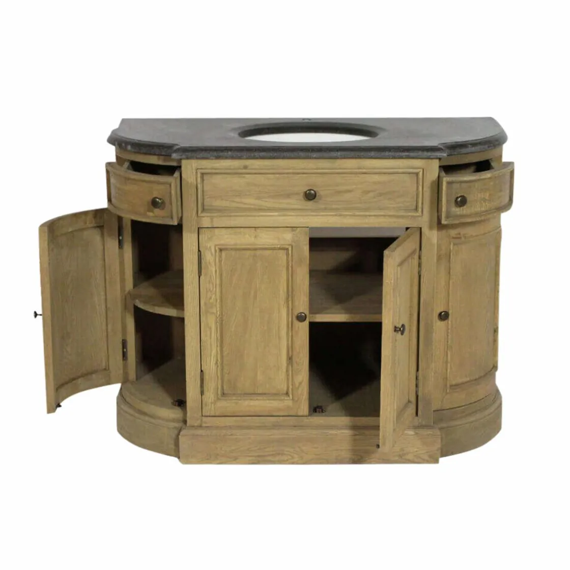 Ce meuble salle de bain est fourni avec sa vasque. Livré en 2 parties : partie basse + plateau en pierre bleue de Chine avec vasque intégrée. Diamètre robinet : 3.5cm – Diamètre de la bonde 40 mm -trop plein.