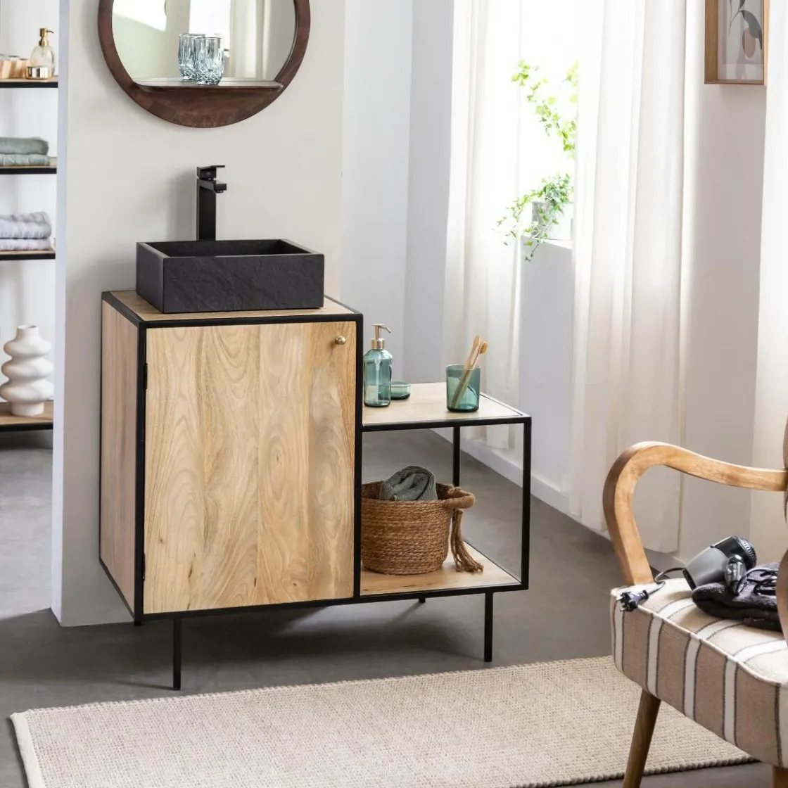 Côté esthétique ; c’est le bois de manguier qui a été choisi pour concevoir ce meuble. En effet, c’est un bois lumineux qui résiste très bien aux variations de température, il est donc parfait pour une pièce comme la salle de bain. L’association avec le métal noir est très bien dosé. C’est doux, c’est original, c’est moderne.
