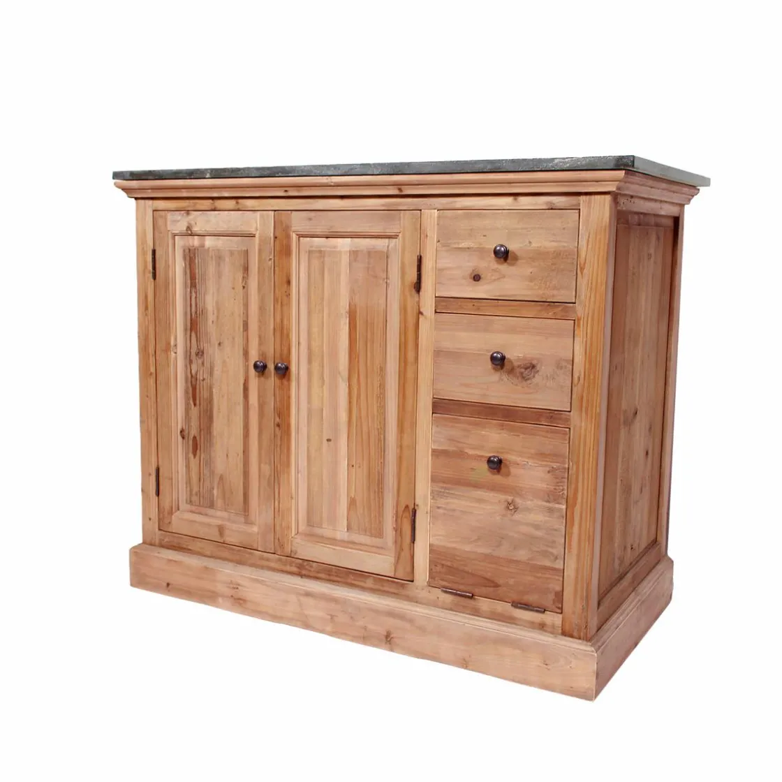 Appréciez le charme et l’authenticité de ce meuble de sous vasque bois massif. Composé en bois recyclé, ce meuble dispose d’un plateau en pierre bleue de Chine et d’une vasque encastrable. Laissez régner une atmosphère zen et apaisante au sein de votre salle de bain en optant pour du mobilier en bois recyclé. A la fois pratique et élégant, ce meuble saura apporter un certain charme grâce à l’alliance du pin recyclé et de la pierre bleue de Chine.