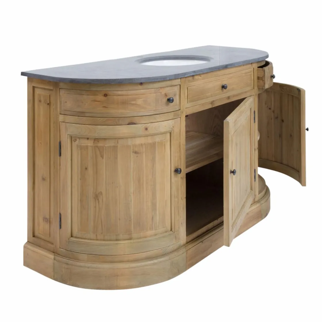 Ce magnifique meuble de salle de bain en bois massif aux formes arrondies apportera à votre intérieur un charme authentique grâce à son vieux pin recyclé, son plateau en pierre bleue de Chine et sa vasque en porcelaine. Les nuances claires de son bois recyclé vous permettront de l’associer sans difficulté à différents univers déco.