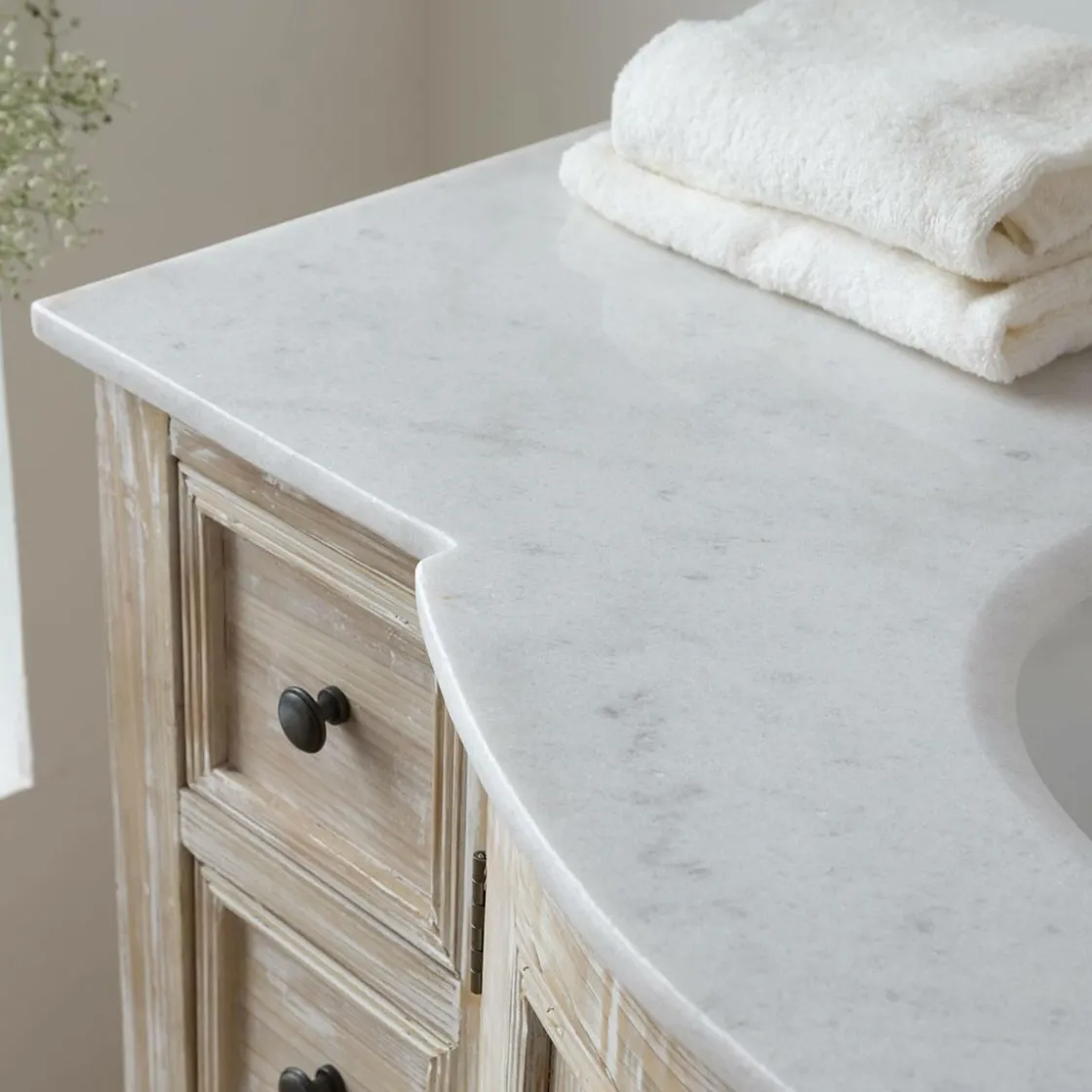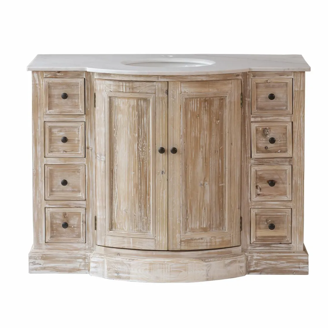 Ce meuble salle de bain bois massif va vous séduire grâce à sa structure constituée de bois recyclé. L’utilisation de ce matériau confère à ce meuble un charme d’antan grâce à ses caractéristiques et aspérités qui lui sont propres. Les nuances du bois qui a été blanchi vont venir apporter une réelle dose de luminosité dans votre intérieur, c’est ce petit plus qui rendra votre salle de bain très cosy. Ce meuble saura aussi bien s’adapter dans une salle de bain moderne que classique grâce à son plateau en marbre blanc.
