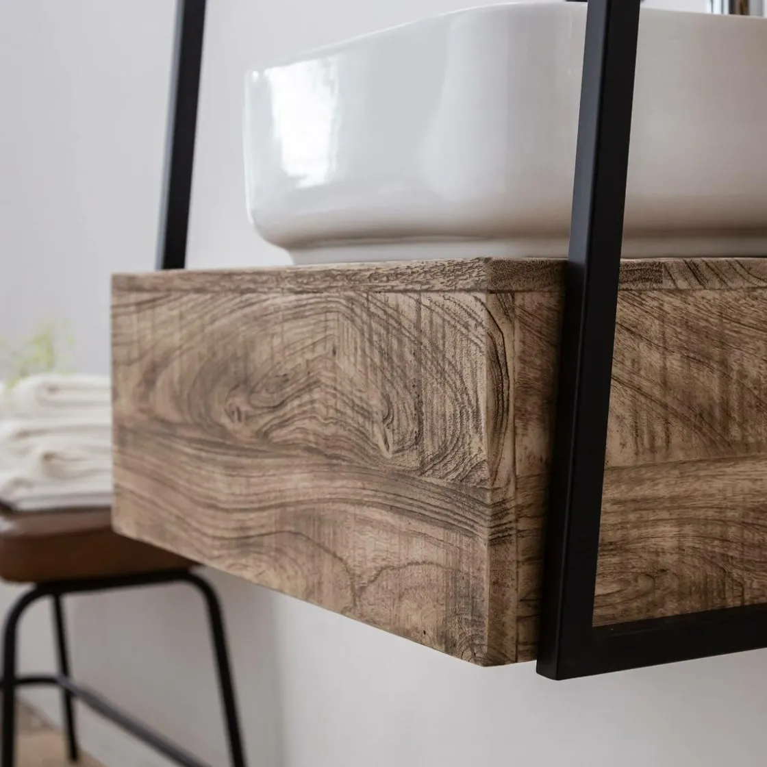 Avec sa structure suspendue, il devient le point focal et un sujet de conversation instantané dans n’importe quel espace. La structure suspendue en métal noire offre un contraste accrocheur avec la beauté subtile du plateau en bois de manguier, ce qui rehausse encore l’attrait de ce meuble. Avec une hauteur de 130 cm, une largeur de 60 cm et une profondeur de 45 cm, ce meuble fantastique est tout à fait charmant, tant sur le plan visuel que pratique.