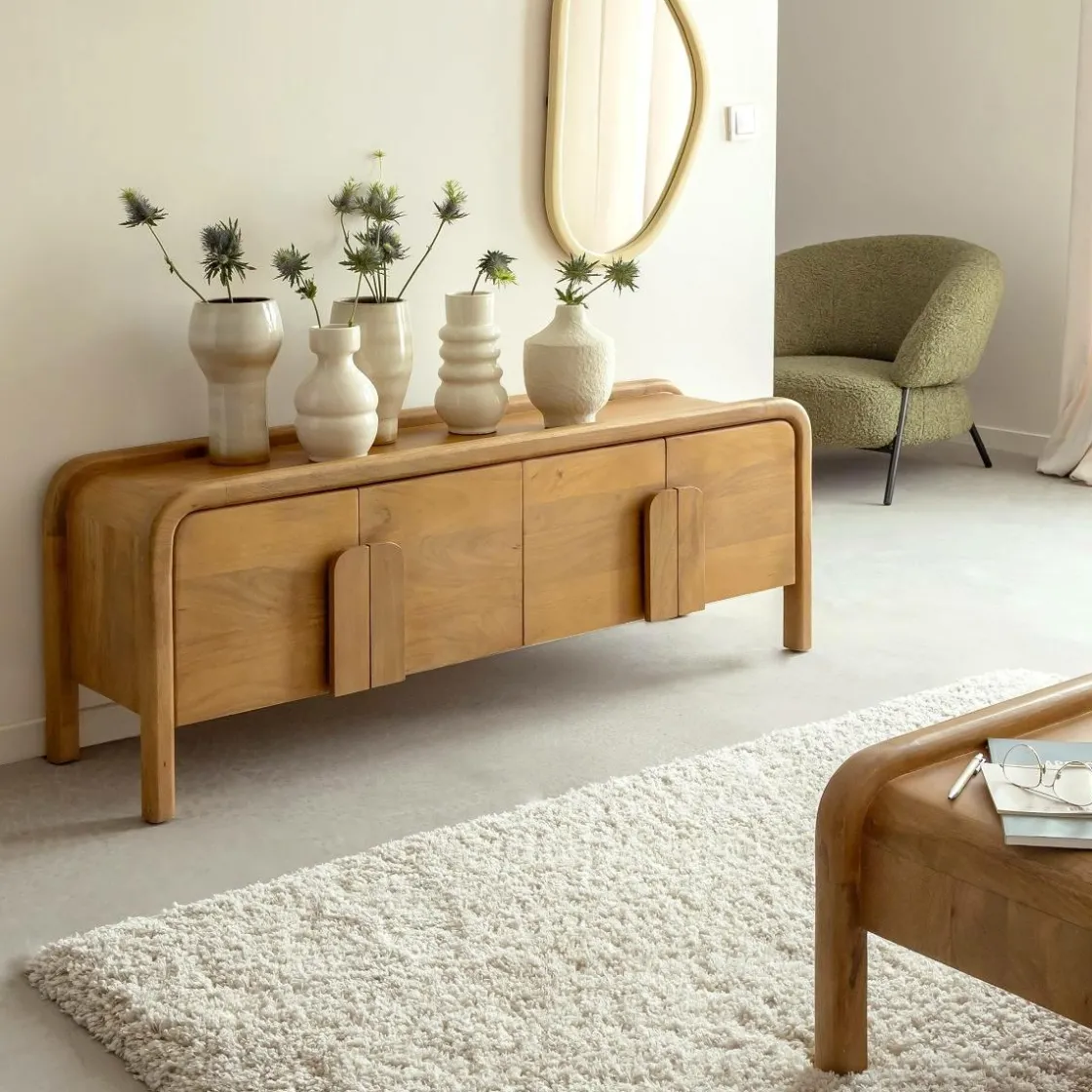 Inspiré par les formes douces et enveloppantes, ce meuble TV en bois de manguier de la collection Féodor conjugue design contemporain et chaleur naturelle. Sa silhouette tout en courbes, portée par des pieds galbés et des bords arrondis, apporte une esthétique fluide et apaisante à votre pièce de vie. Les poignées sculptées dans le prolongement des portes renforcent l’élégance minimaliste du meuble.