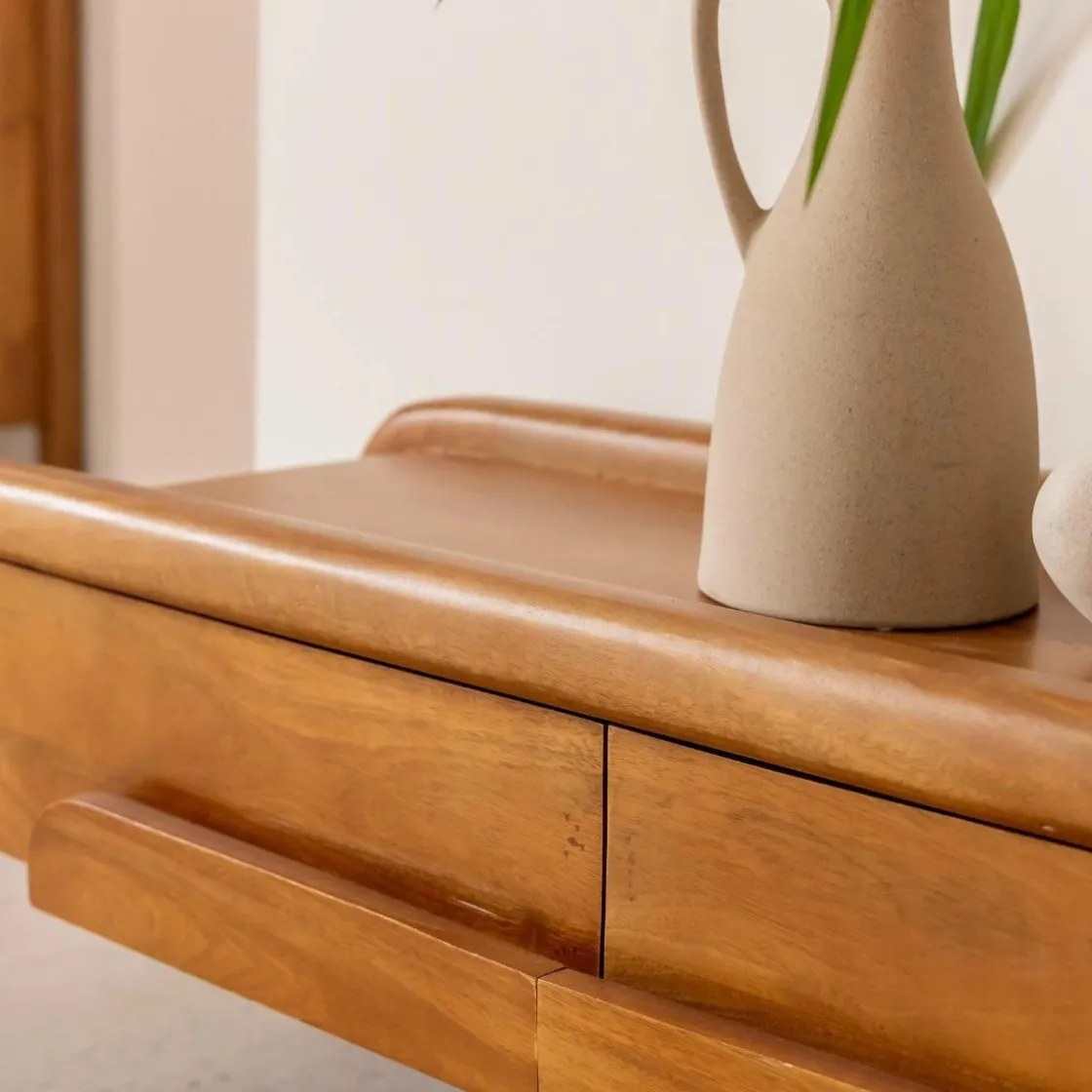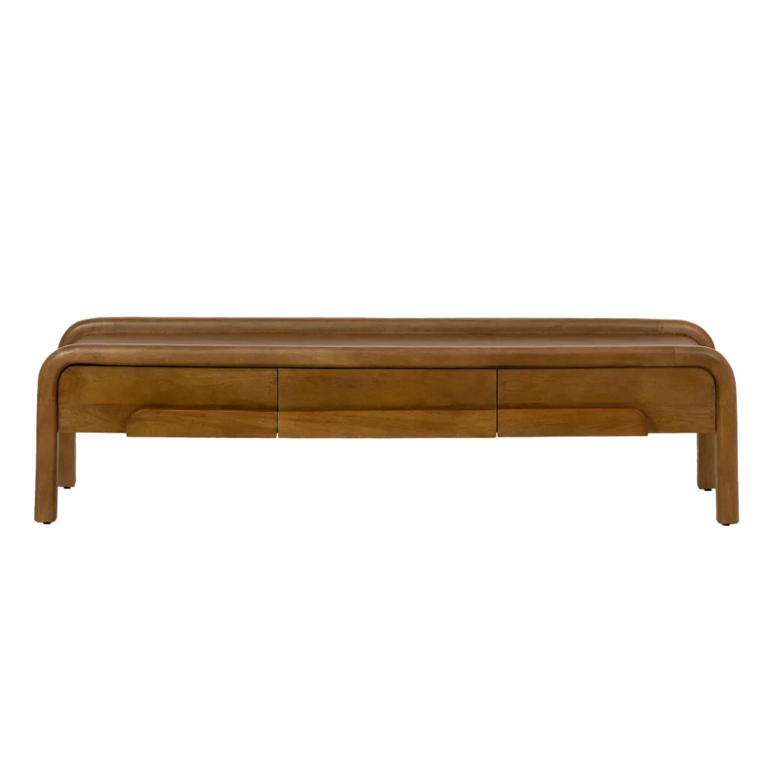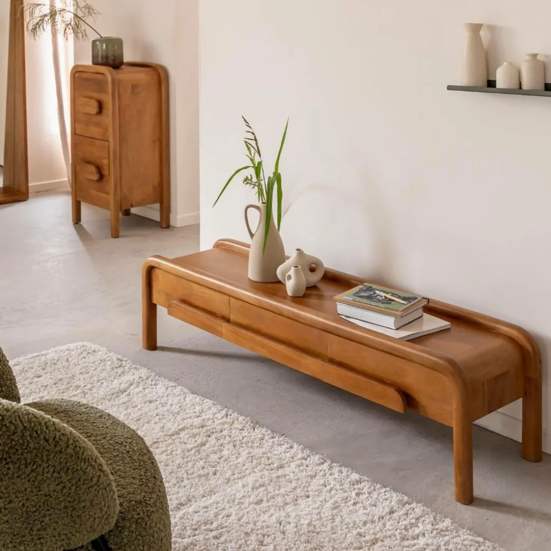 Avec son design tout en courbes et ses lignes enveloppantes, ce meuble TV en bois de manguier de la collection Féodor se distingue par son élégance et sa fonctionnalité bien pensée. Les formes arrondies de la structure, les angles adoucis et le piètement fin donnent au meuble une silhouette fluide, inspirée des codes organiques et contemporains.