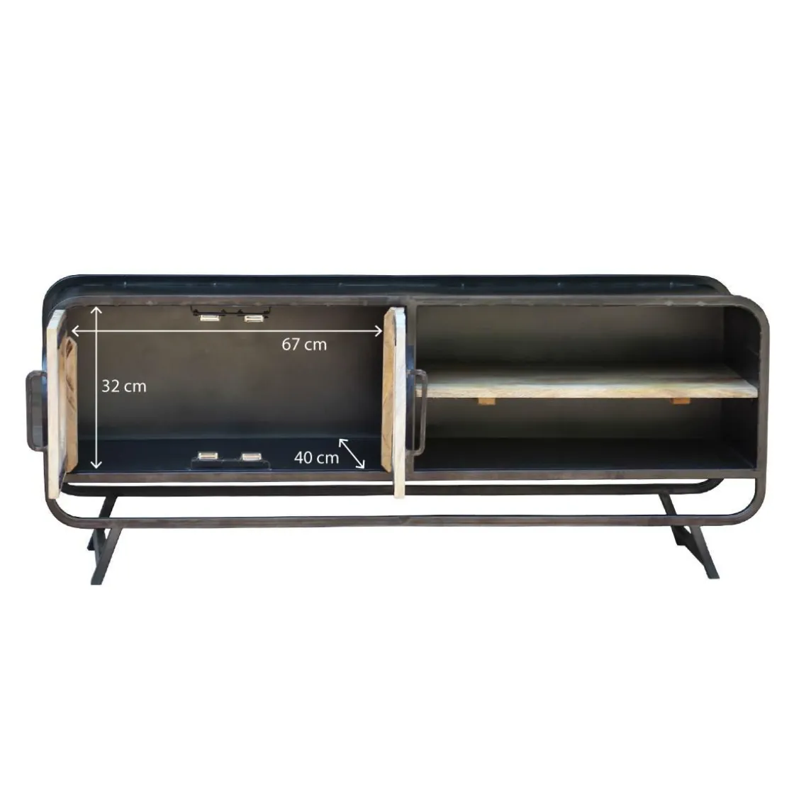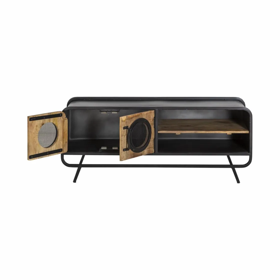 Ce meuble TV industriel est conçu de façon à vous offrir un meuble très robuste. Vous retrouverez une structure principalement constituée de métal gris assurant la solidité du meuble. Concernant les portes et l’étagère, c’est le bois de manguier qui a été sélectionné. Ainsi, ce meuble vous propose un contraste entre les nuances du métal et celles du bois. Cela apporte énormément de charme à cette pièce unique qui amènera une réelle dose d’originalité mais aussi de luminosité dans votre intérieur. Ce meuble TV industriel possède un atout principal, ce sont les deux motifs ronds en métal situés sur ses portes. Ce design nous rappel des hublots ce qui apporte une touche vintage et une sensation de voyage que l’on adore !